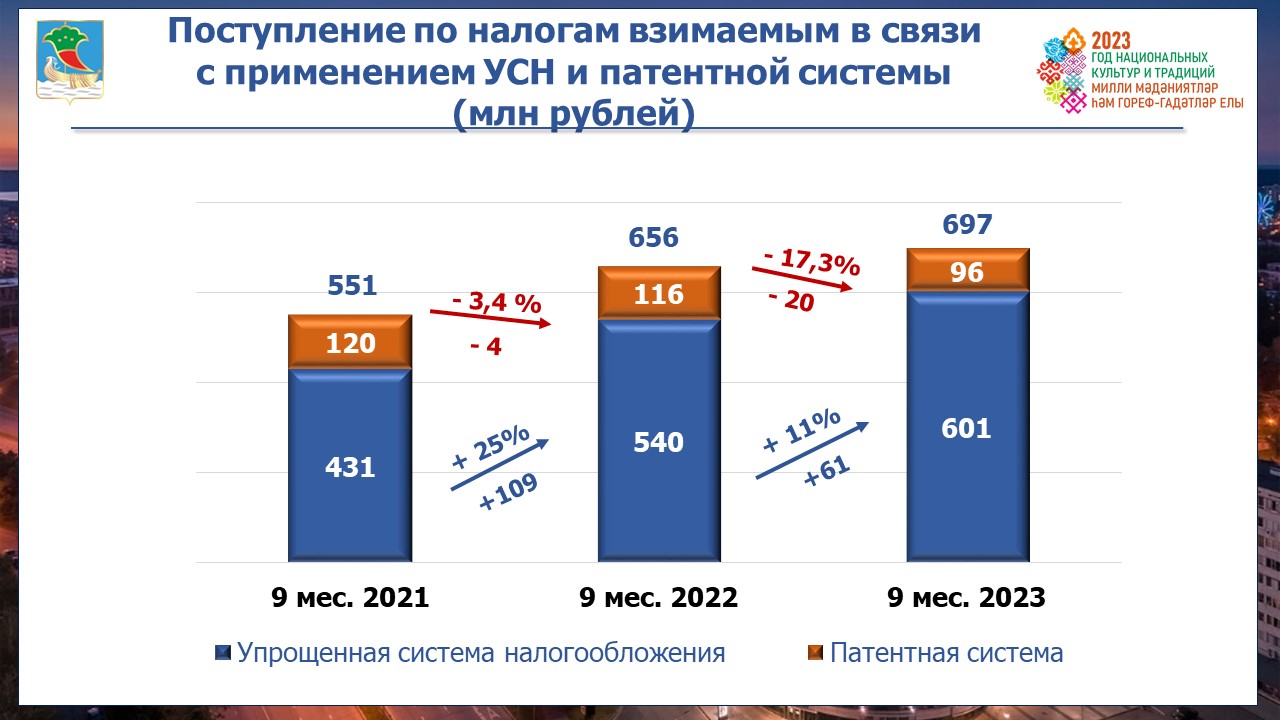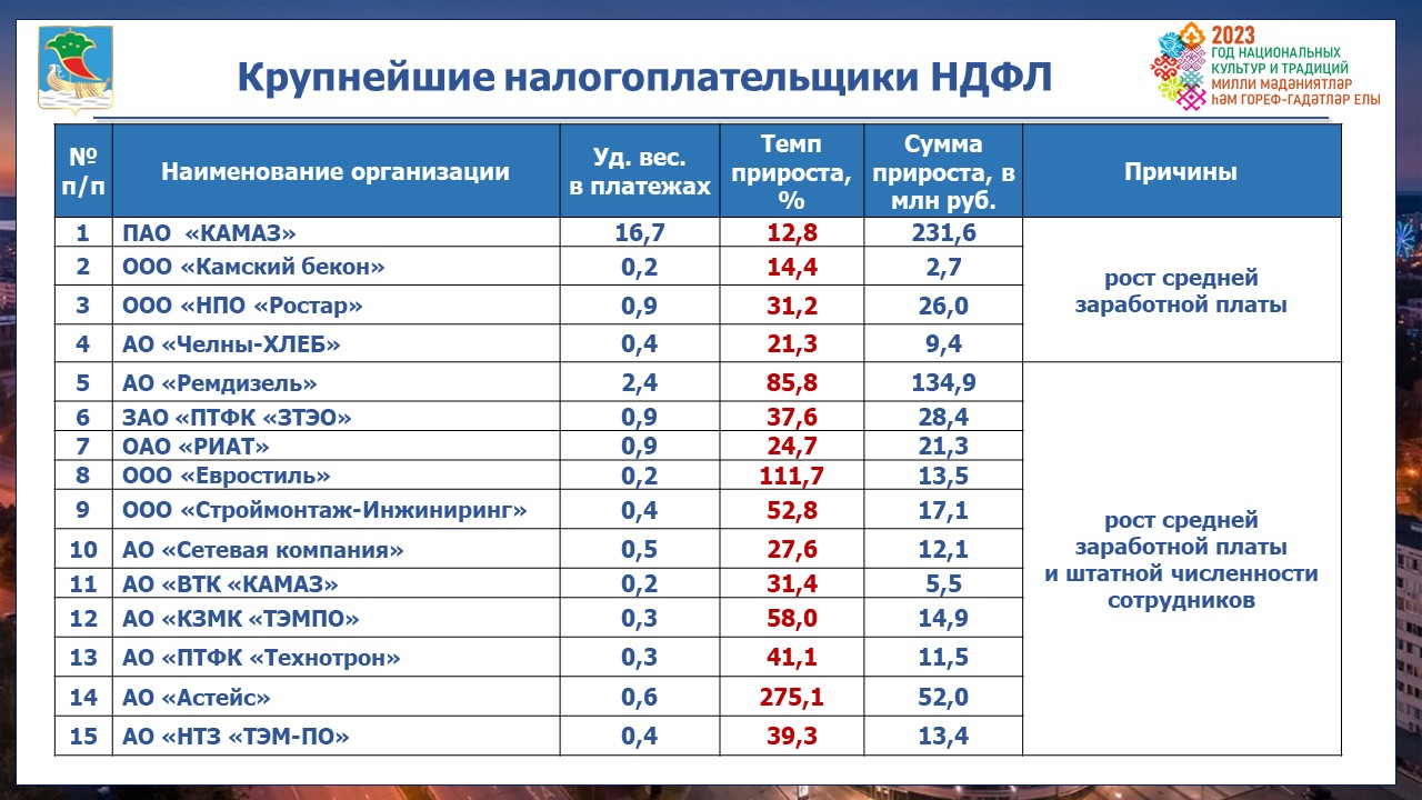 Поступления в бюджет города от резидентов территории опережающего развития составили 210 млн рублей, с ростом к 2022 году на 79%. В консолидированный бюджет Республики Татарстан НДФЛ резидентами перечислен в сумме 707 млн рублей.