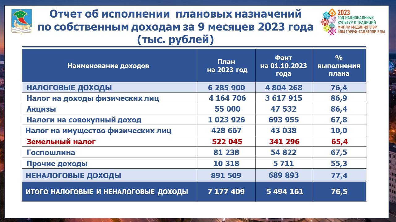 Плановые назначения по собственным доходам за 9 месяцев 2023 года перевыполнены на 2%. Исполнение составило 77%.