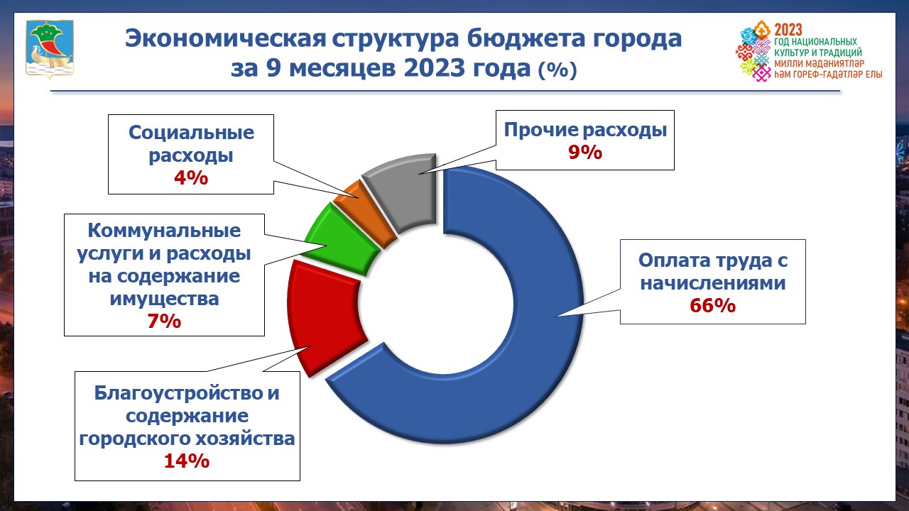 Основная доля расходов – 66% в экономической структуре – приходится на выплату заработной платы сотрудников бюджетной сферы. Также основные направления дополнительных расходов бюджета – приобретение автобусов и транспортные услуги, проведение антитеррористических и противопожарных мероприятий, текущего ремонта муниципальных организаций, разработка проектно-сметной документации, исполнение предписаний и обращений граждан в систему «Народный контроль», оказание социальных мер поддержки льготной категории детей, трудоустройство подростков и организация летнего отдыха, проведение городских мероприятий и другие социально-значимые направления.