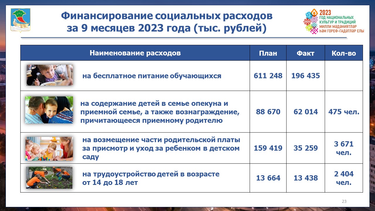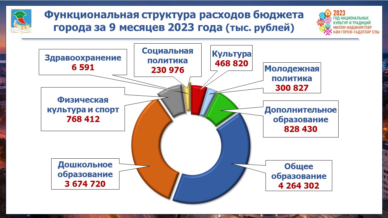 По итогам 9 месяцев 2023 года доход от оказания платных услуг муниципальными организациями получен в сумме 485 млн рублей. Средства, полученные от внебюджетной деятельности направлены на увеличение размера заработной платы работников и содержание имущества. План на 2023 год, утвержденный Постановлениями Кабинета Министров РТ и Исполнительным комитетом города выполнен на 77%.