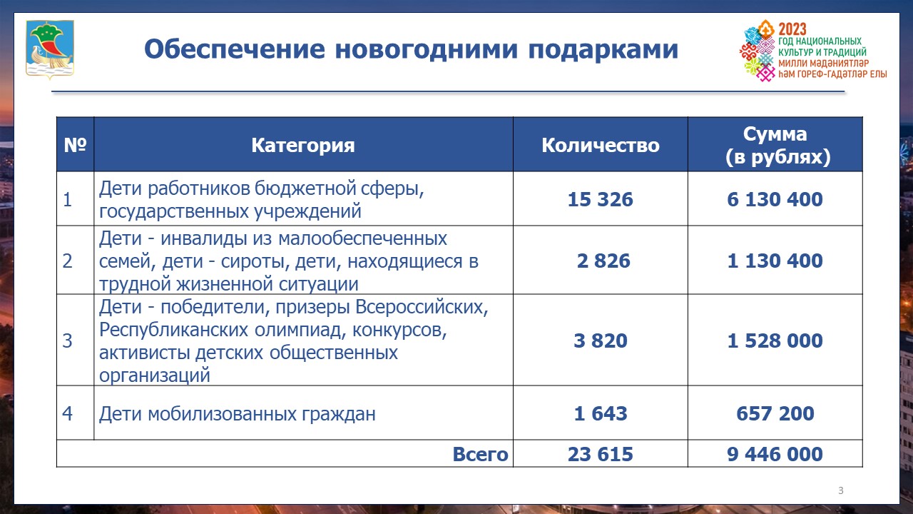 В преддверии новогодних праздников будут обеспечены новогодними подарками дети работников бюджетных учреждений, дети-инвалиды, дети из малообеспеченных семей, опекаемые дети, дети, находящиеся в трудной жизненной ситуации, победители и призеры Всероссийских, Республиканских олимпиад.