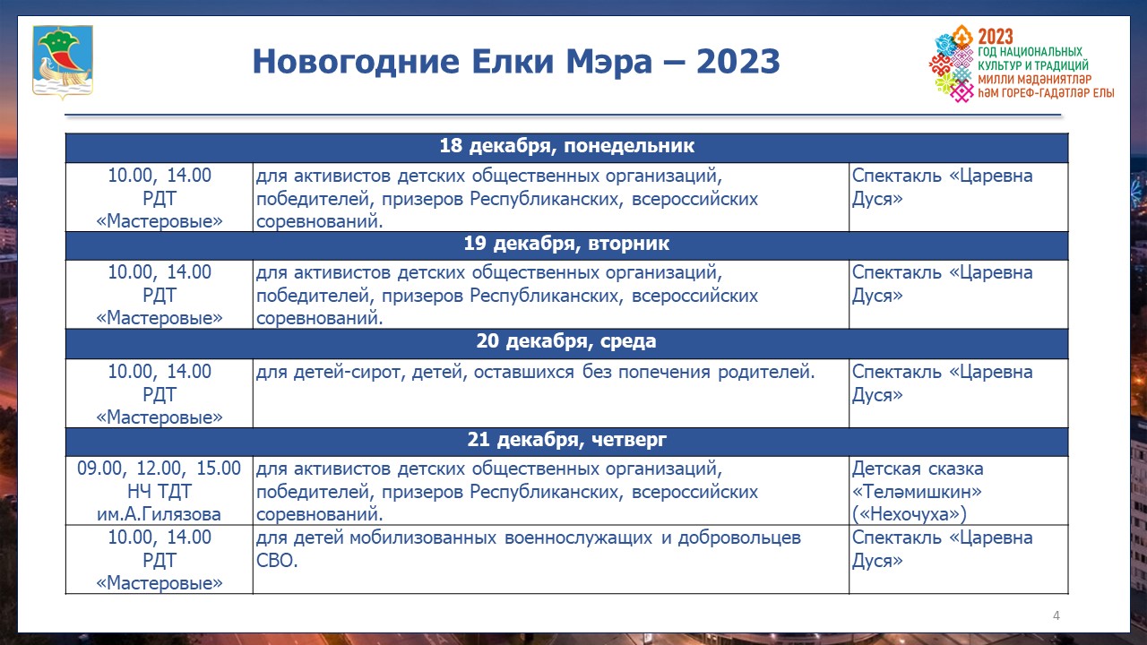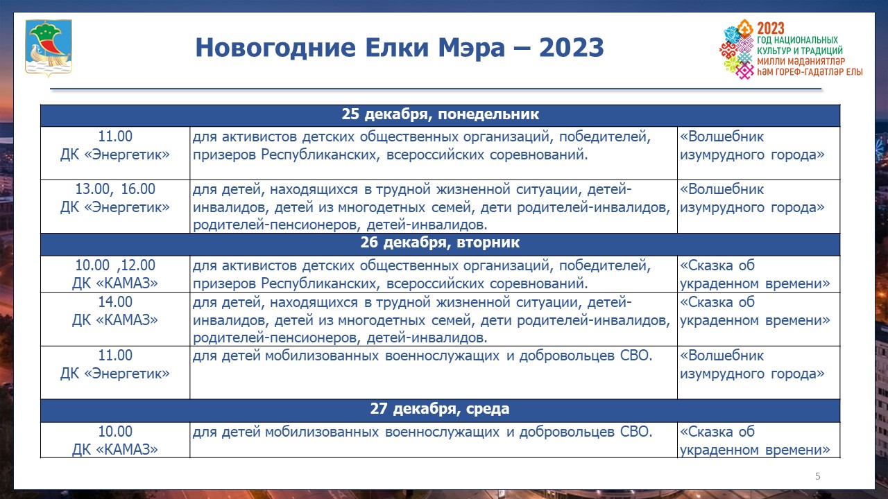 С 18 по 27 декабря состоятся елки мэра для почти 8 тысяч юных челнинцев. Их посетят дети-инвалиды, дети из малообеспеченных семей, активисты общественных организаций и отличники учебы, дети мобилизованных граждан.