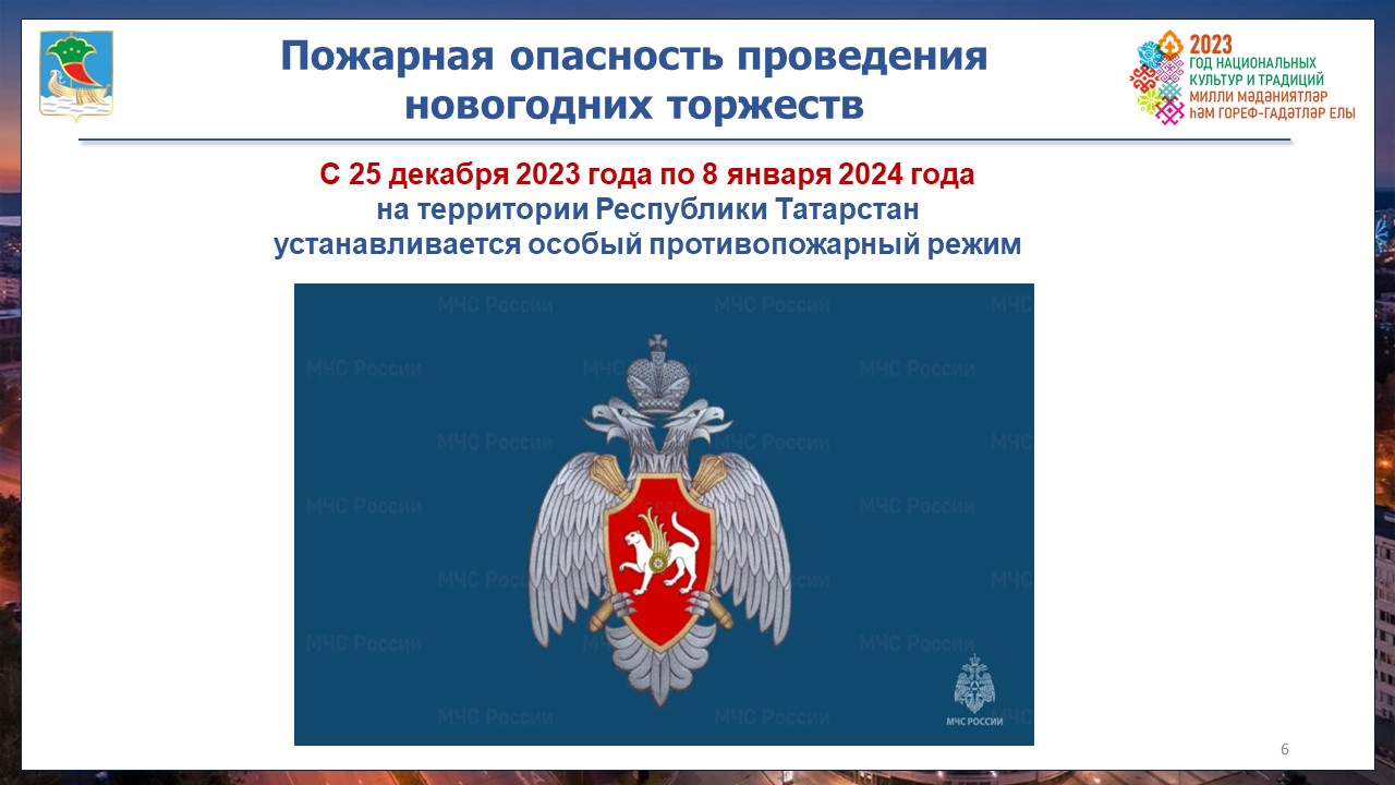 С 25 декабря 2023 по 8 января 2024 года на территории Республики Татарстан вводится особый противопожарный режим, согласно которому на определенных территориях запрещено использовать пиротехнические изделия.