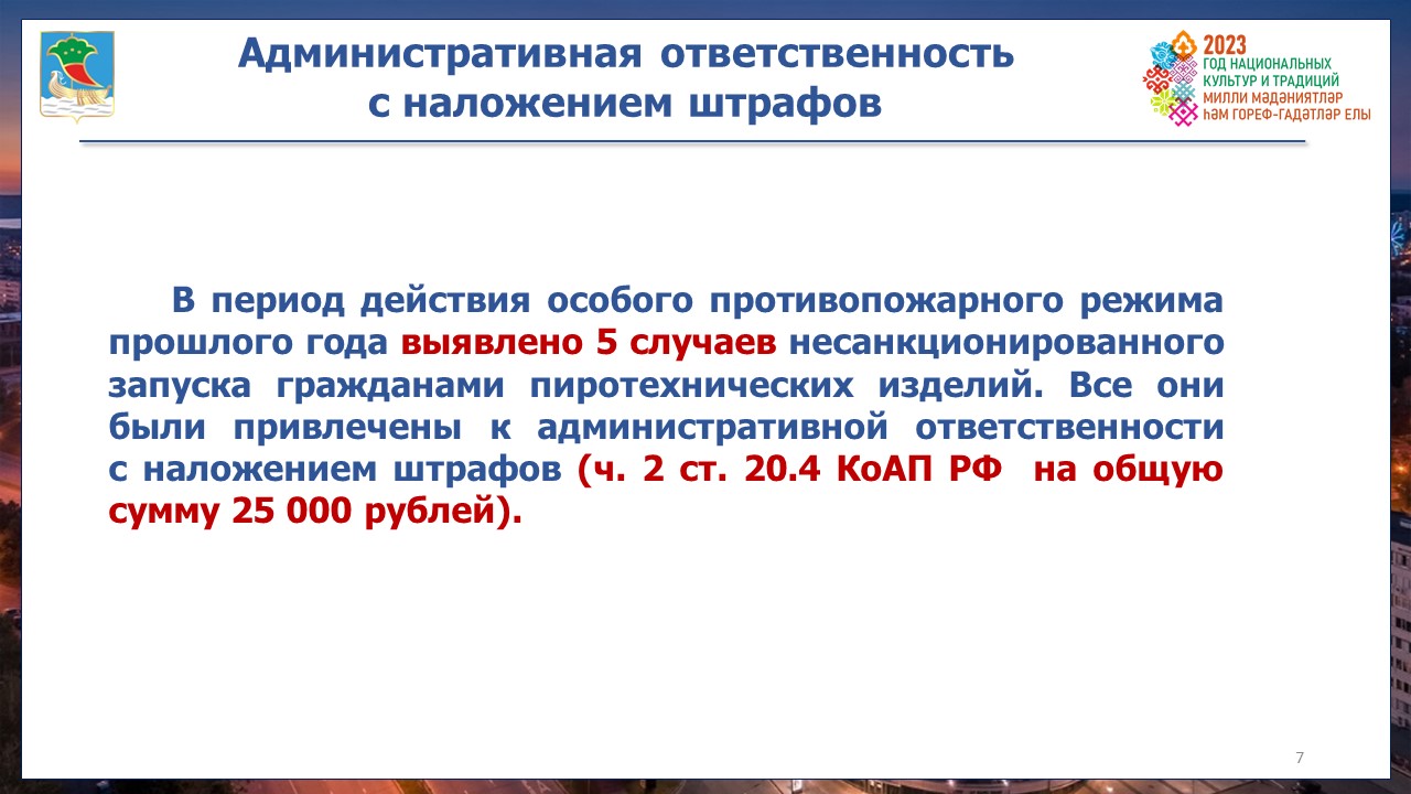 Сотрудниками надзорной деятельности совместно с сотрудниками полиции будут проведены рейды. В период действия особого противопожарного режима прошлого года выявлено 5 случаев несанкционированного запуска гражданами пиротехнических изделий. Все они были привлечены к административной ответственности с наложением штрафов на общую сумму 25 тысяч рублей.