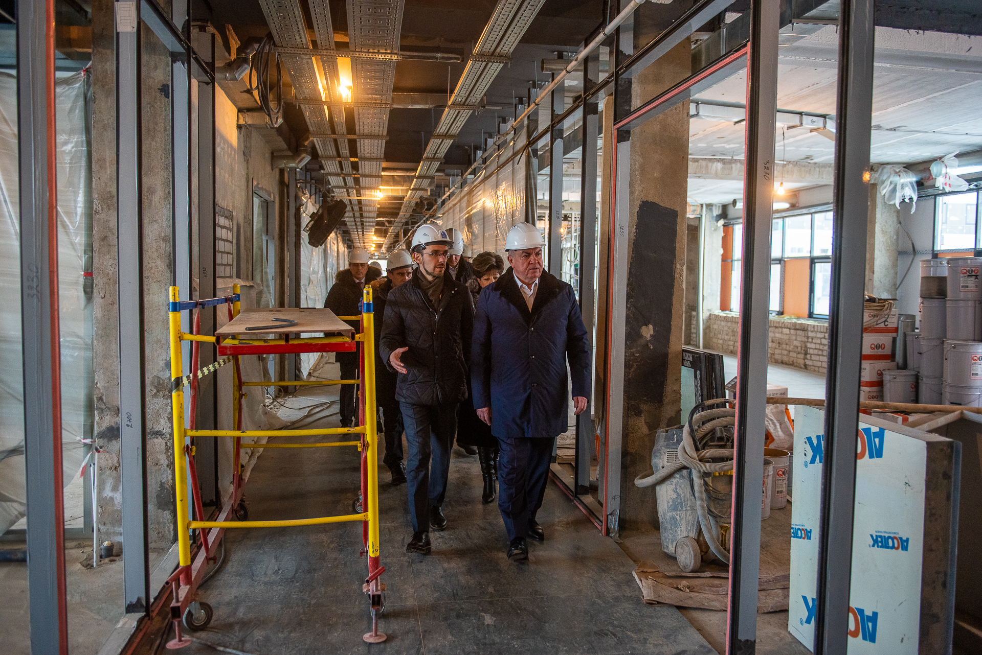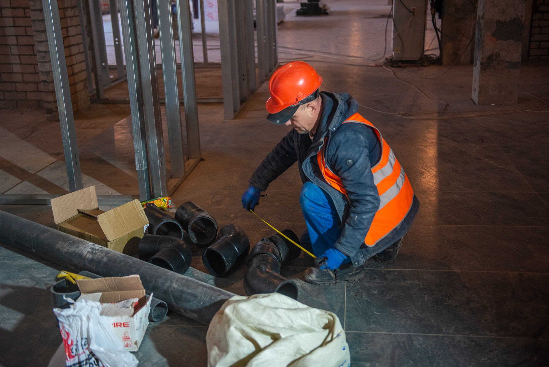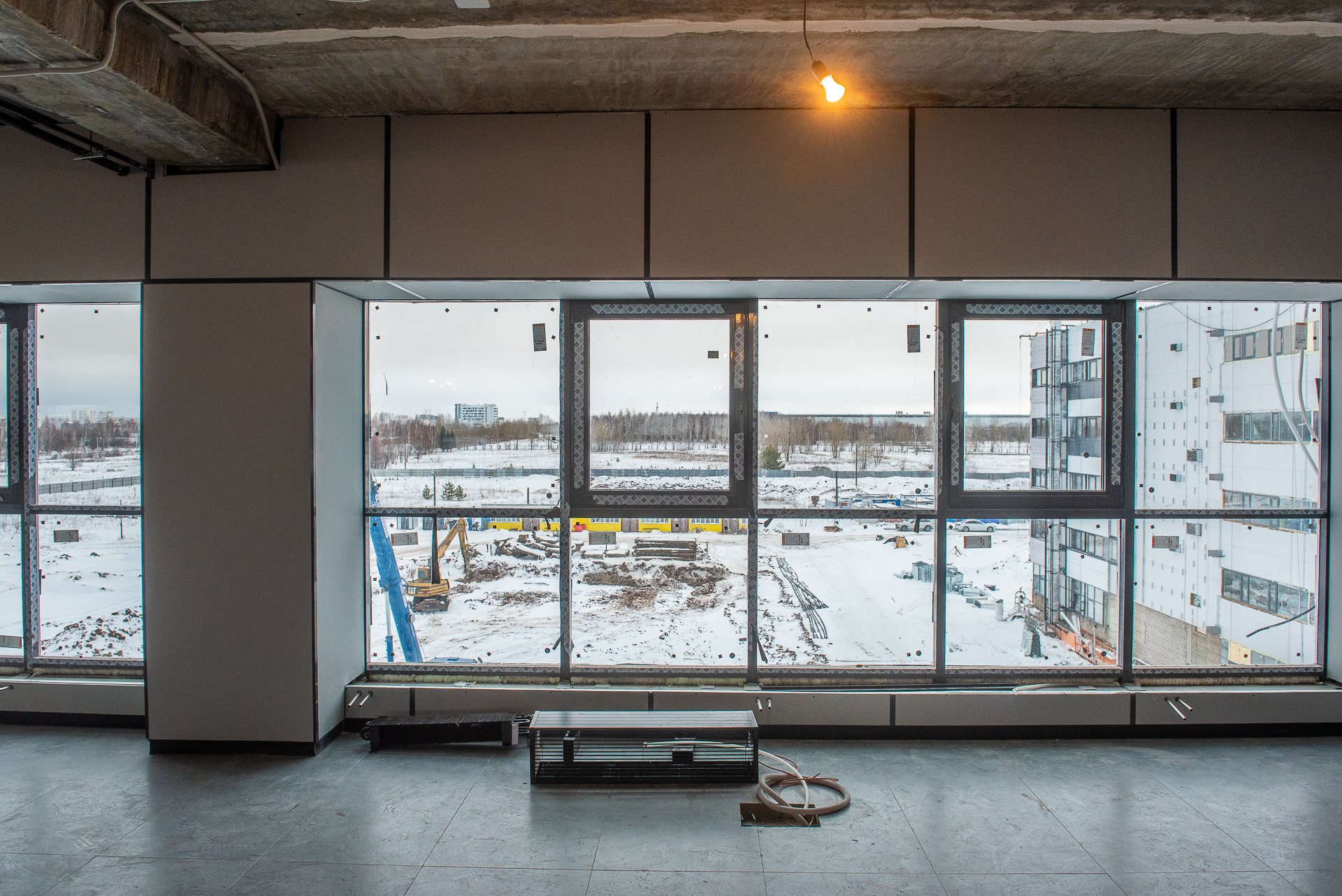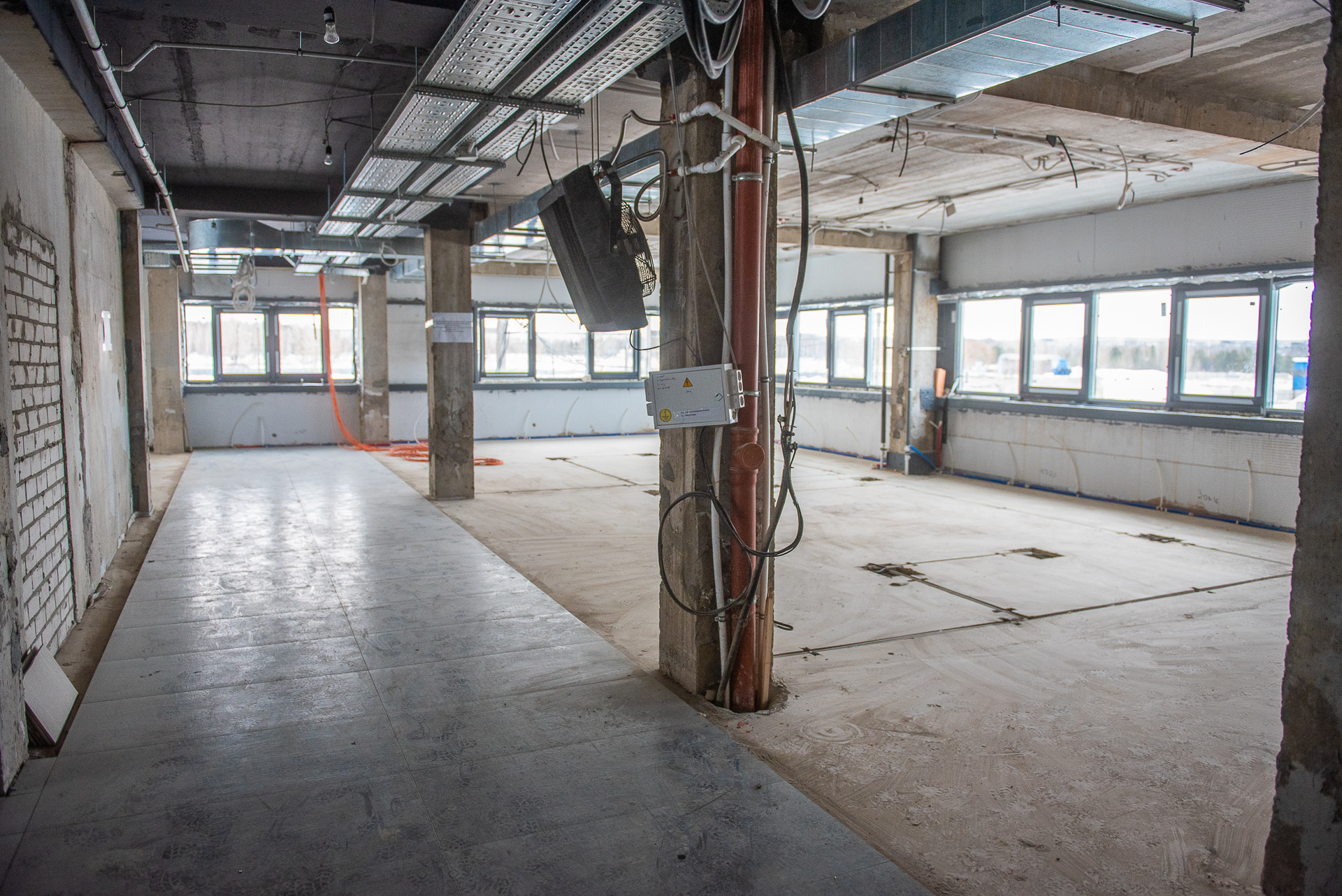 Внутри же в первом блоке полностью заменена кровля и гидроизолирован подвал, разведены внутренние инженерные сети, снаружи меняется фасад – порядка 35% новых панелей уже смонтированы. Здание состоит из четырех этажей, сейчас монтируются гипсокартонные перегородки.