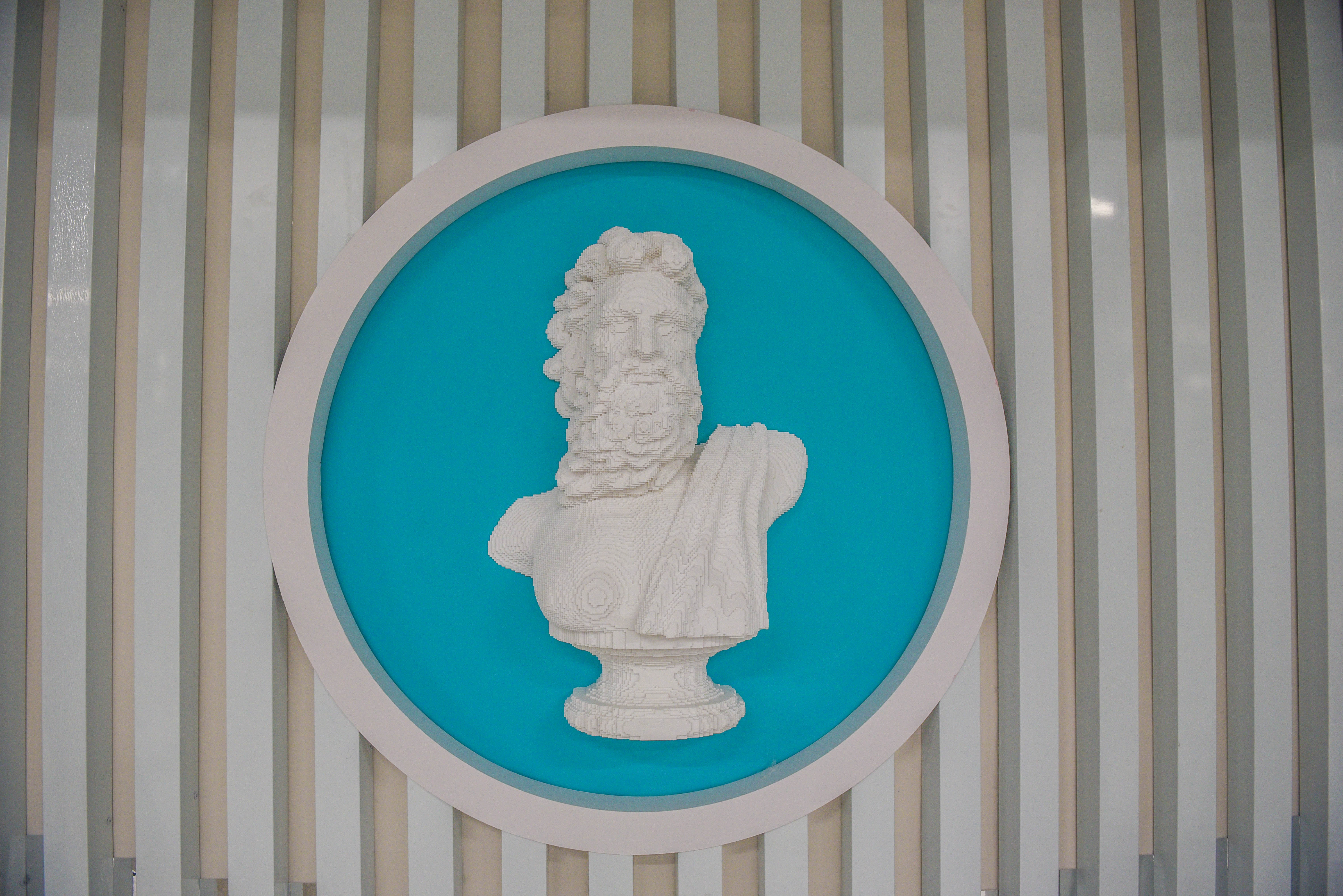 Лестничная зона обрела морскую тематику, где рядом расположен настенный фонтан. Стены украшают бюсты греческих богов Олимпа в объемном пиксельном формате.