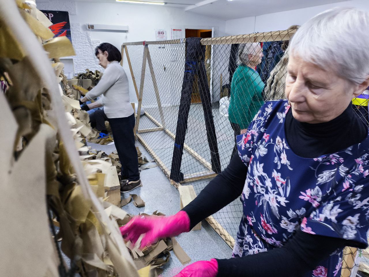 Неравнодушные жители плетут маскировочные сети для военнослужащих. Всего уже сплетено 3120 сетей. Процесс создания маскировочной сети трудоёмкий: лоскуты подбирают по цвету и оттенку в зависимости от необходимого рисунка.