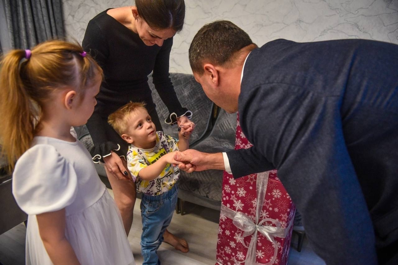 Несмотря на определенные ограничения здоровье трехлетний Арсений любит подтягиваться и посещает бассейн. Руководитель Исполнительного комитета Фарид Салахов вручил новогодний подарок Аресению и его сестре.