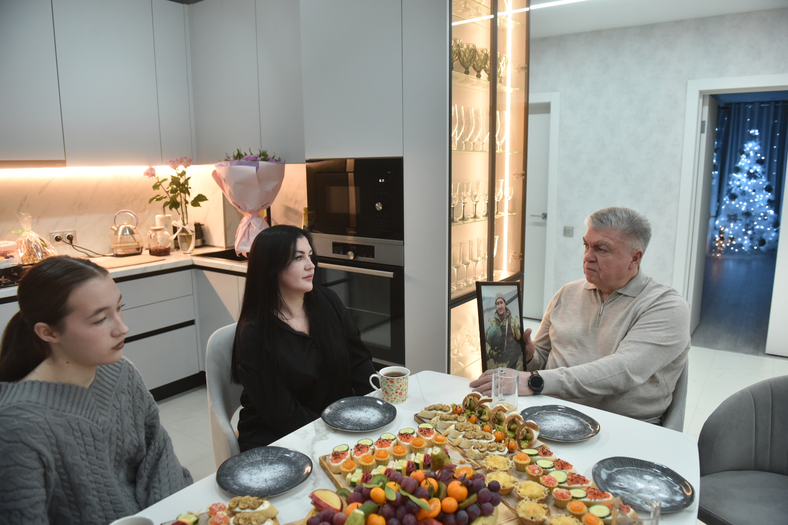 Мэр в разговоре с семьей отметил, что их папа и супруг настоящий герой и они должны гордиться им. Андрей Петрович - подполковник, пенсионер МВД. В октябре 2022 года отправился на фронт, погиб. В декабре во Дворце торжеств вдове передан орден Мужества.