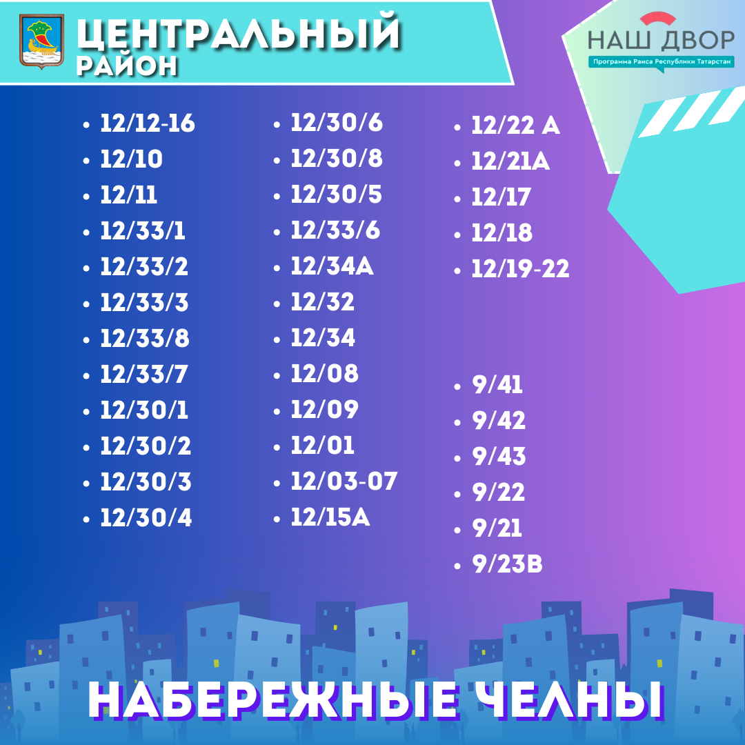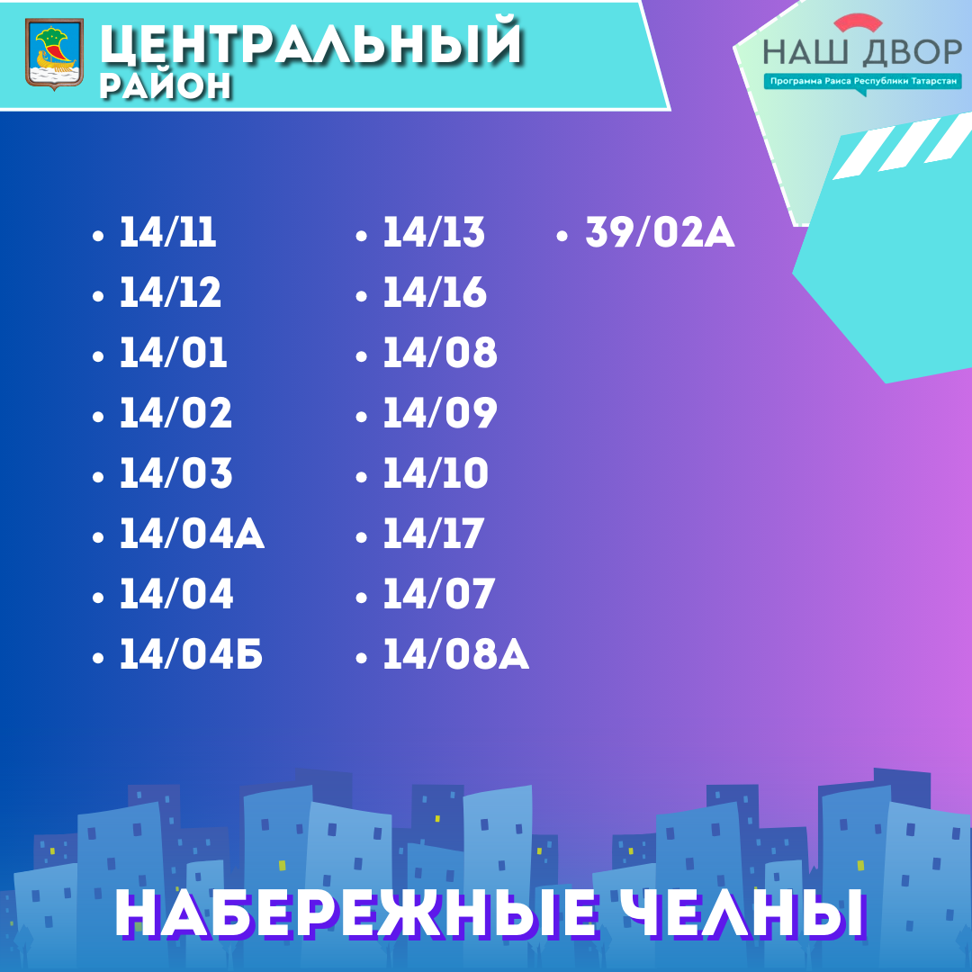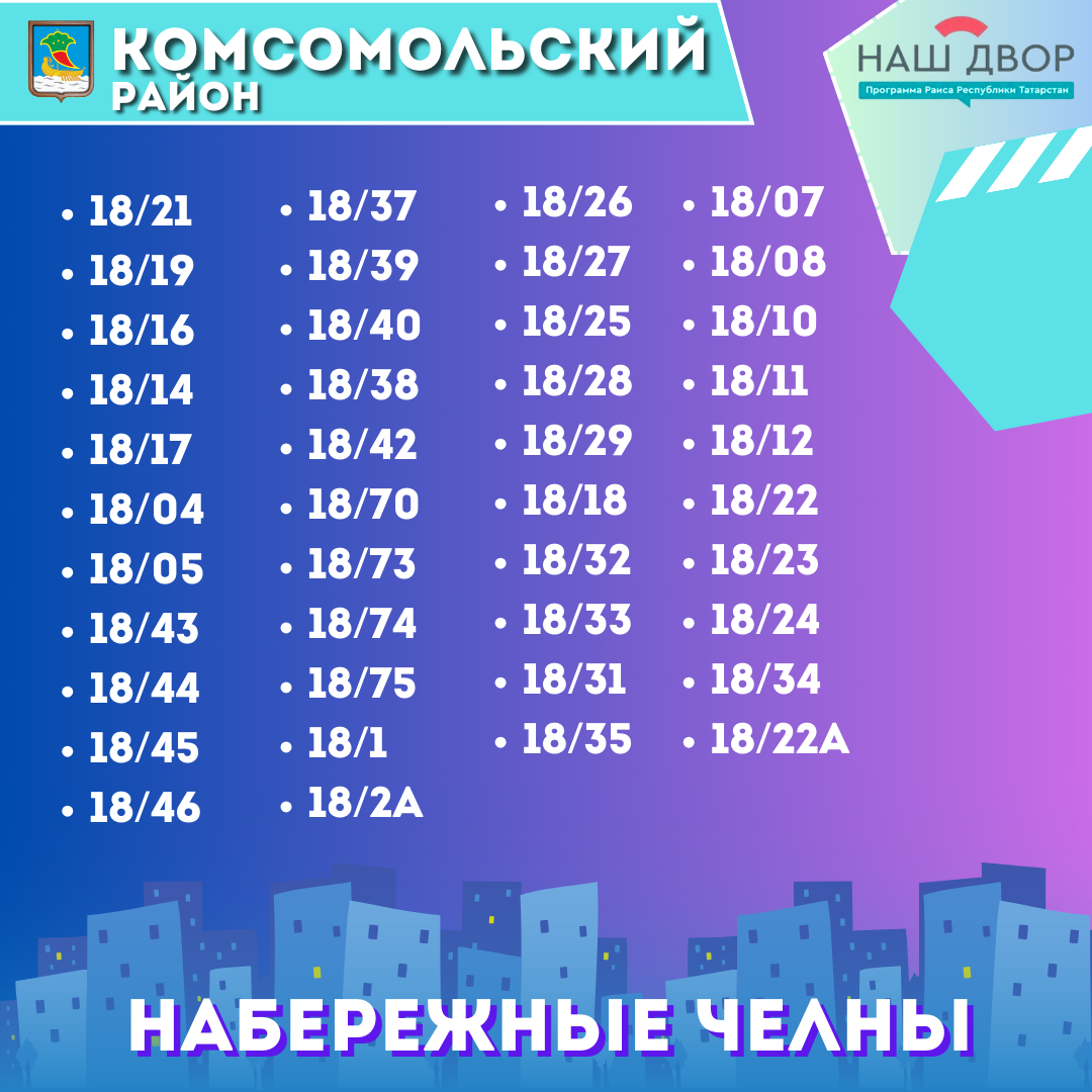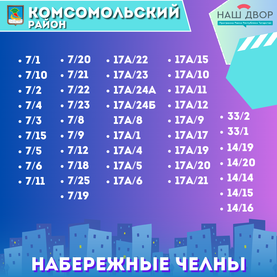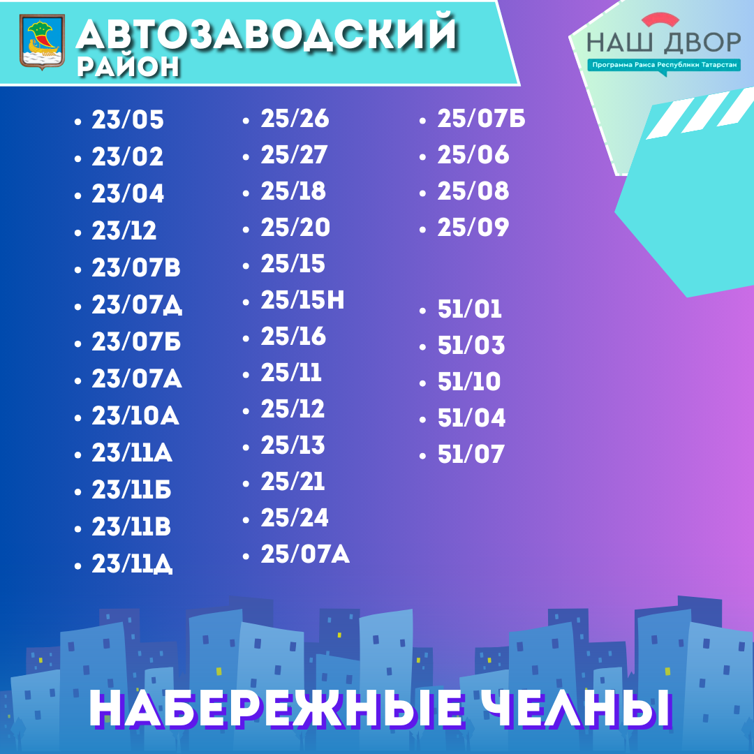 В Набережных Челнах под программу благоустройства «Наш двор» вошли 79 дворовых территорий: в Комсомольском районе – 35 дворов, по 22 двора в Центральном и Автозаводском районах. Отметим, что за преображения дворовых территорий голосовали сами жители. Более подробную информацию можно узнать на официальном сайте программы Раиса Республики Татарстан «Наш двор».