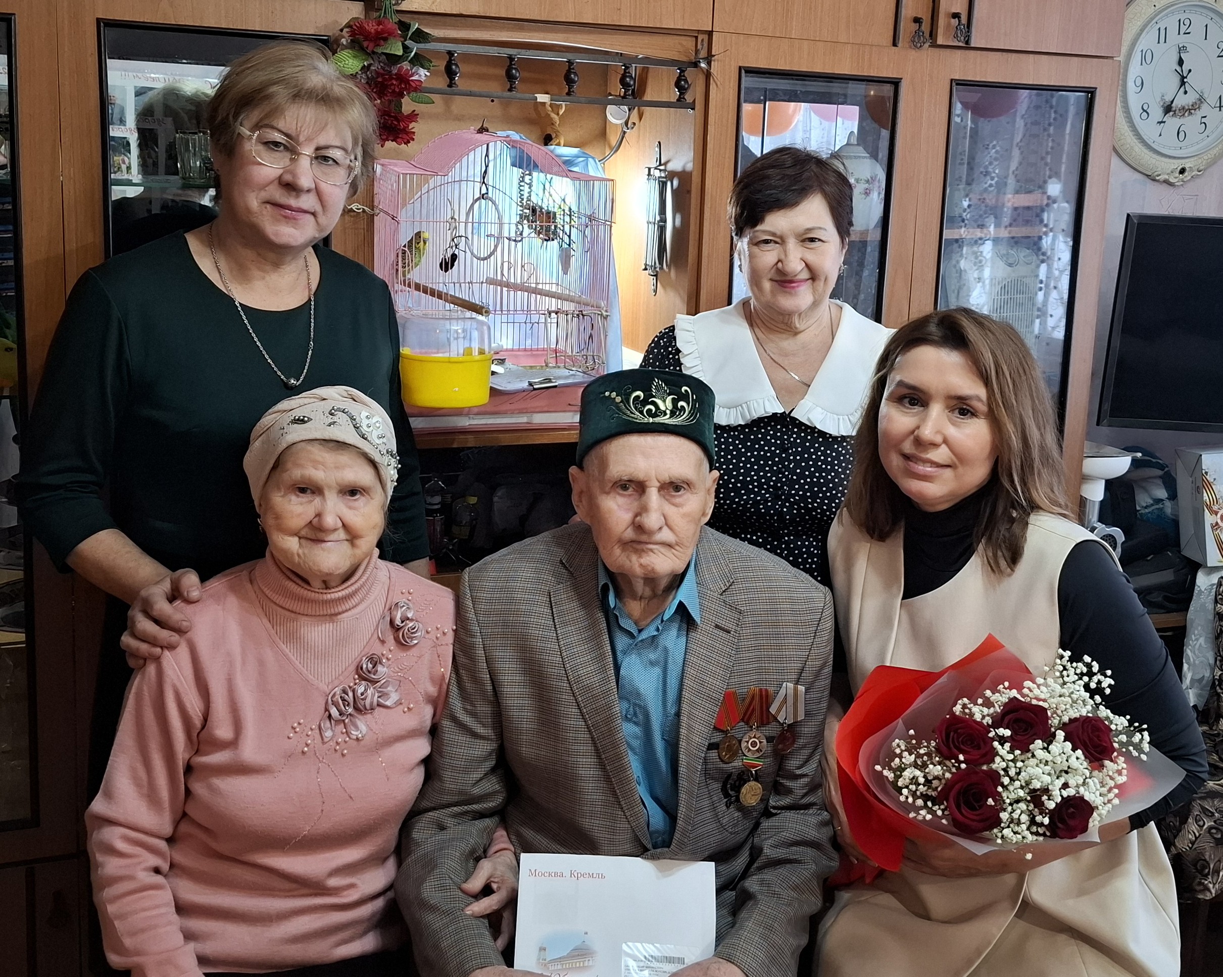 От имени Президента Российской Федерации Владимира Путина и мэра города Наиля Магдеева юбиляра поздравила заместитель главы администрации Комсомольского района Эльвира Валиева.