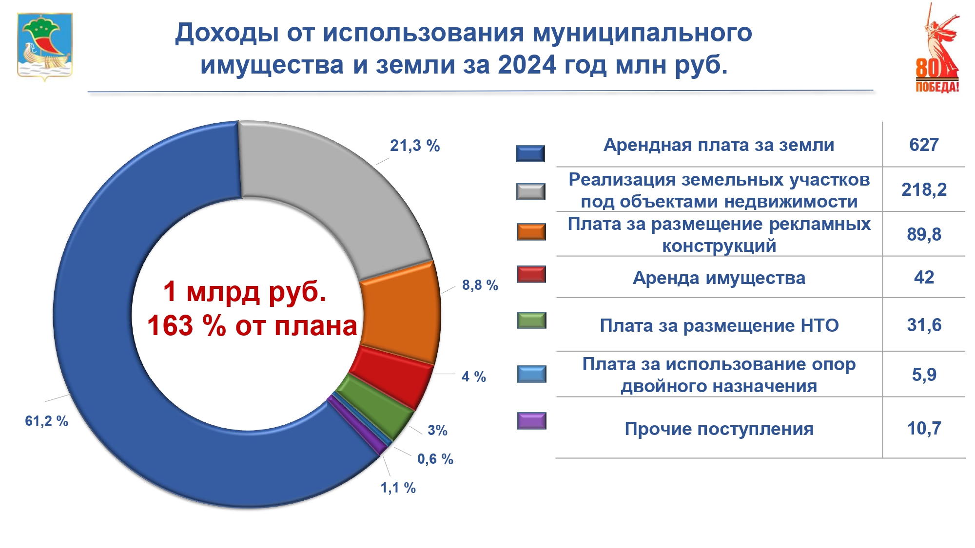 "Одним из главных показателей эффективности и результативности управления муниципальным имуществом являются финансовые поступления в бюджет города от использования муниципальной собственности. Так, за 2024 год бюджет города пополнился на 1 млрд  руб. при плановых показателях 628,5 млн руб. Дополнительно поступило 396,8 млн руб. План выполнен на 163 %", – отметил Ленар Гизатуллин.