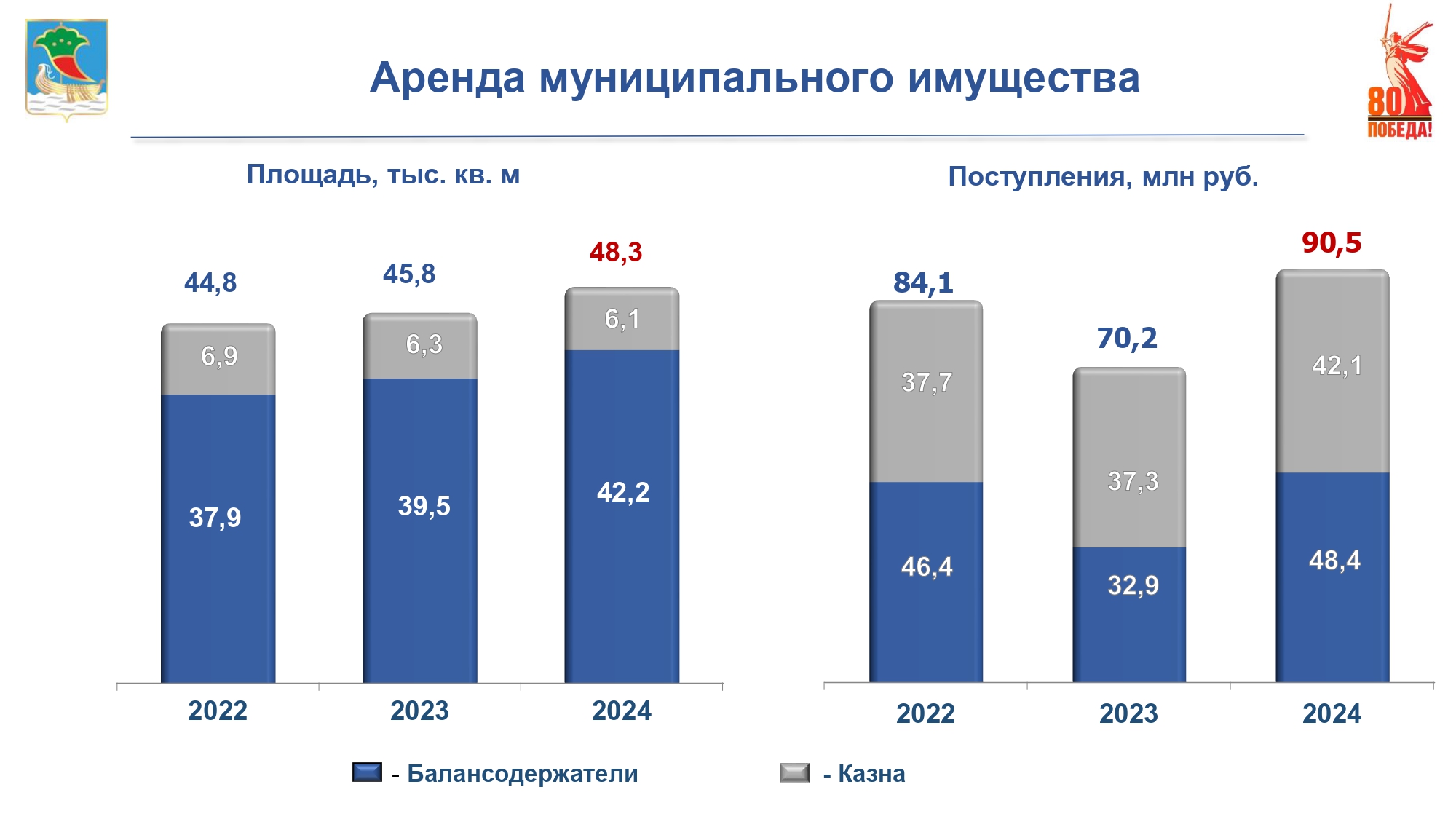 За отчетный период от аренды муниципального имущества получены денежные средства в размере 90,5 млн руб., в том числе: более 42 млн руб. – по договорам аренды имущества казны; более 48 млн руб. – по договорам аренды имущества, закрепленного за муниципальными учреждениями и предприятиями.