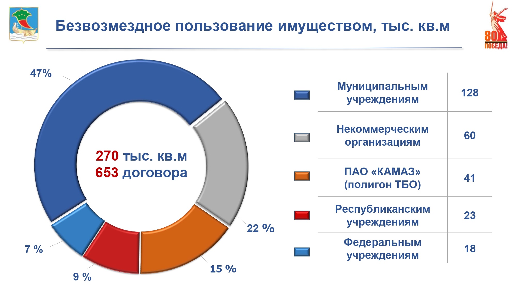 270 тыс. кв. м  муниципального имущества по 653 договорам переданы в безвозмездное пользование федеральным, республиканским, муниципальным учреждениям и социально-ориентированным некоммерческим  организациям, осуществляющим свою деятельность  в сфере развития спорта, образования и культуры.