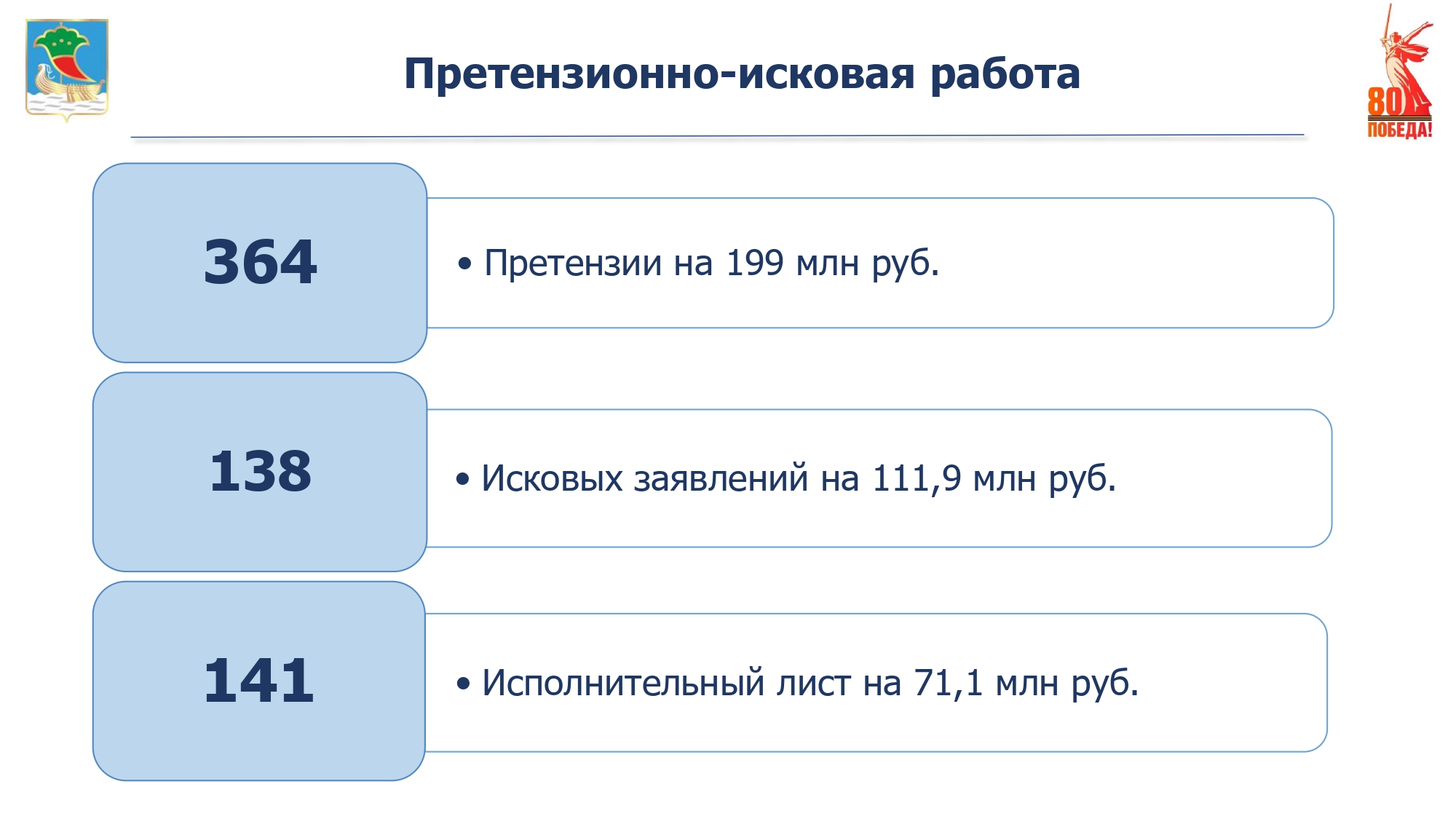 За 2024 год предъявлено 364 претензии на сумму 199 млн руб.; подано 138 исковых заявлений для взыскания задолженности в судебном порядке на общую сумму 111,9 млн руб. В результате принятия мер досудебного урегулирования спора и на стадии судебного разбирательства погашена задолженность в размере 50 млн руб. В целях принудительного исполнения решения суда за 2024 год направлен 141 исполнительный лист на сумму 71,1 млн руб., фактически взыскано 20,2  млн руб.