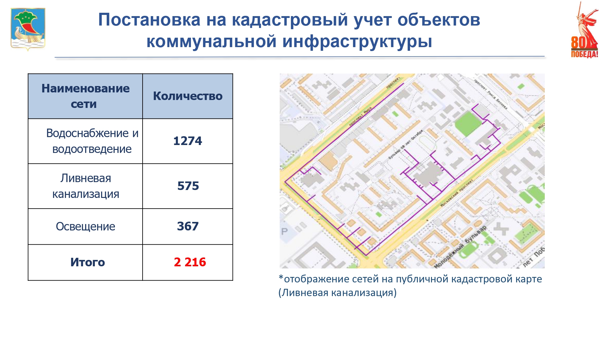 В отчетном году проведена работа по постановке  на кадастровый учет и государственной регистрации  права муниципальной собственности города Набережные Челны на объекты коммунальной инфраструктуры в количестве 2 216 ед. (водоснабжение и водоотведение, ливневая канализация, наружное освещение). Проводимая работа позволит передать объекты коммунальной инфраструктуры  в целях их надлежащей эксплуатации специализированным организациям на долгосрочный период на условиях договора аренды  и обслуживания.
