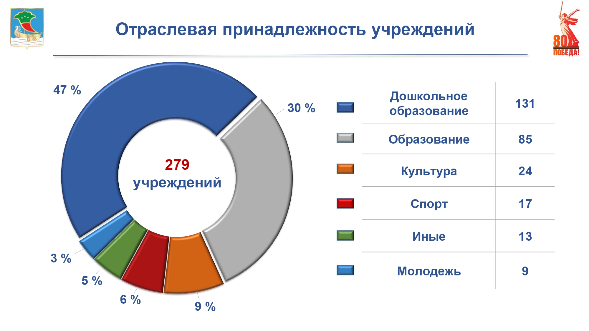На 1 января 2025 года в Реестре муниципальной собственности числятся 279 муниципальных учреждений, в том числе: 131 дошкольное образовательное учреждение; 85 образовательных учреждения; 24 учреждения культуры; 17 учреждений спорта; 9 учреждений молодежи; 13 иных учреждений.