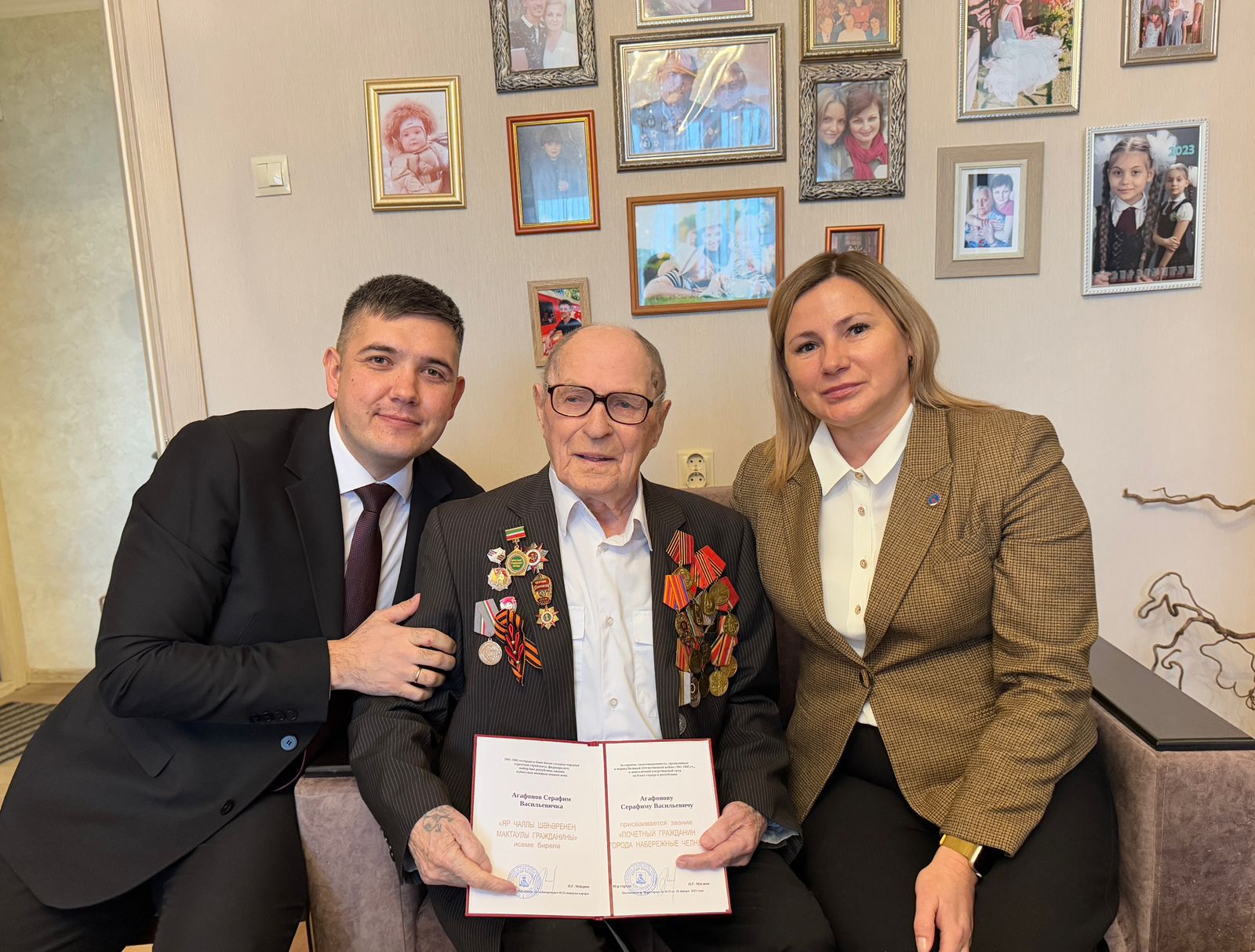 Чаллы хакиме Наил Мәһдиев исеменнән ветеранны муниципаль берәмлек башлыгы урынбасары Ирина Сәгыйдуллина һәм Үзәк районы хакимияте башлыгы Фидәрис Хәбибуллин котлады.