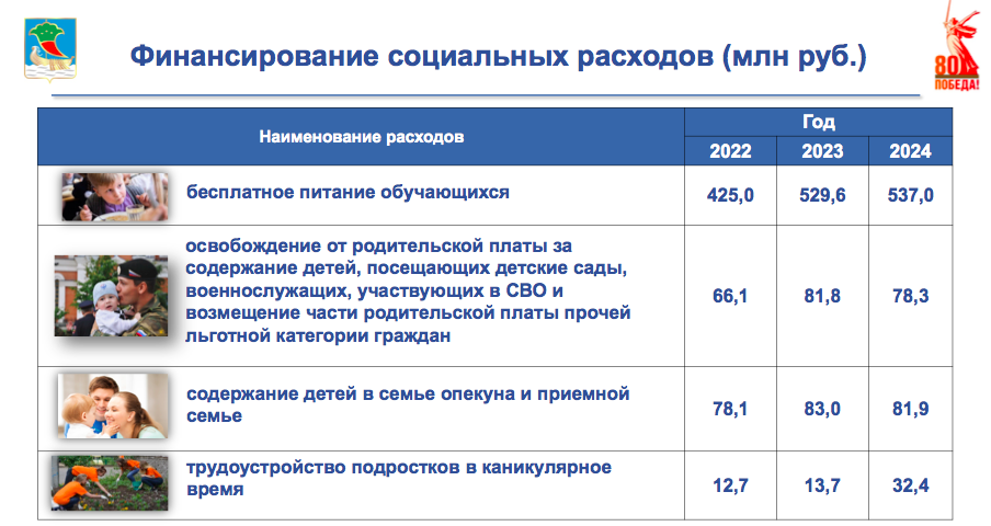 Бюджет города Набережные Челны продолжает сохранять свою социальную направленность. За 2024 год на социальную политику выделено 999 млн рублей, из них 537 млн рублей – на организацию бесплатного питания учащихся, в том числе для детей военнослужащих, участвующих в специальной военной операции, детей инвалидов, с ограниченными возможностями здоровья, из многодетных семей и учеников 1-4 классов.