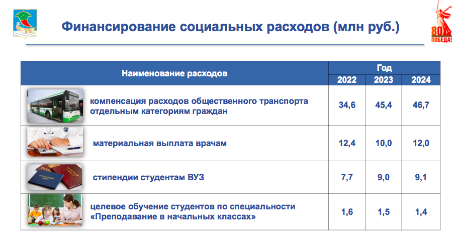 В расходной части бюджета на обеспечение жильем молодых семей определена сумма в размере 8,4 млн рублей; на выплаты стипендий студентам-целевикам образовательных организаций высшего образования – 9 млн рублей, а на целевое обучение студентов по образовательным программам среднего профессионального образования по специальности «Преподавание в начальных классах» – 1,4 млн рублей.