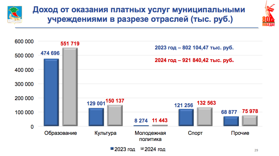 "По итогам 2024 года доход от оказания платных услуг муниципальными организациями получен в сумме 922 млн рублей. Средства, полученные от внебюджетной деятельности направлены на увеличение размера заработной платы работников и содержание муниципальных учреждений города. План на 2024 год, утвержденный Постановлениями Кабинета Министров Республики Татарстан и Исполнительным комитетом города выполнен на 118%", – сказала Светлана Мулюкова.