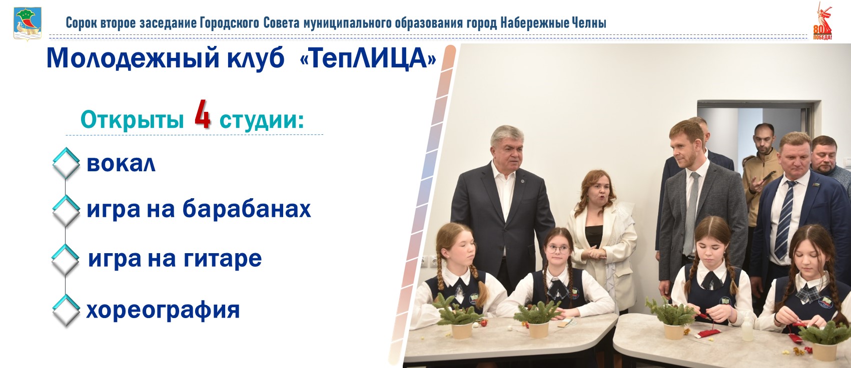 В 2024 году капитально отремонтирован молодежный клуб «ТепЛИЦА»В настоящее время есть потребность в создании подобного молодежного клуба и в микрорайоне Замелекесье.