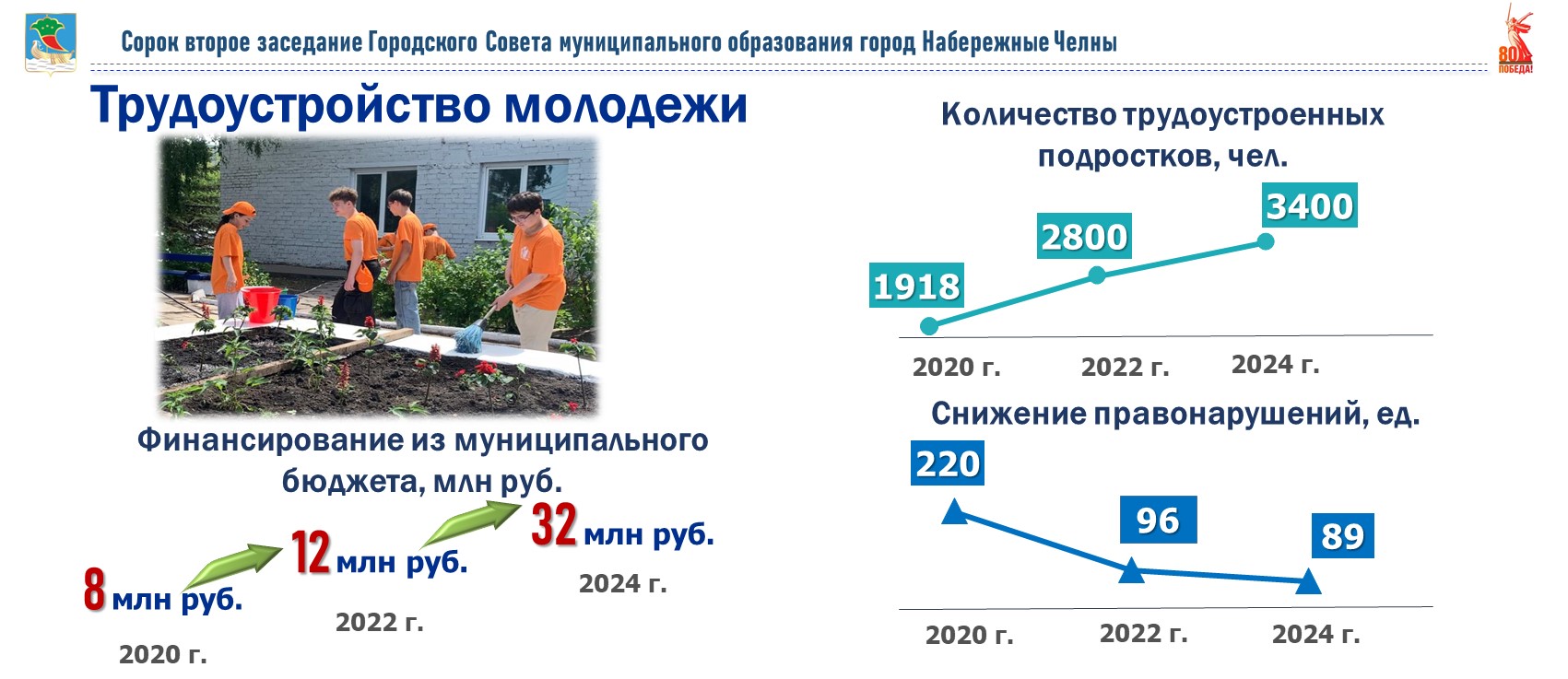 Серьезное внимание уделяется и вопросу трудоустройства подростков. В прошлом году в период летних каникул были трудоустроены 3 400 детей. Для этих целей из городского бюджета направлено 32 млн рублей.