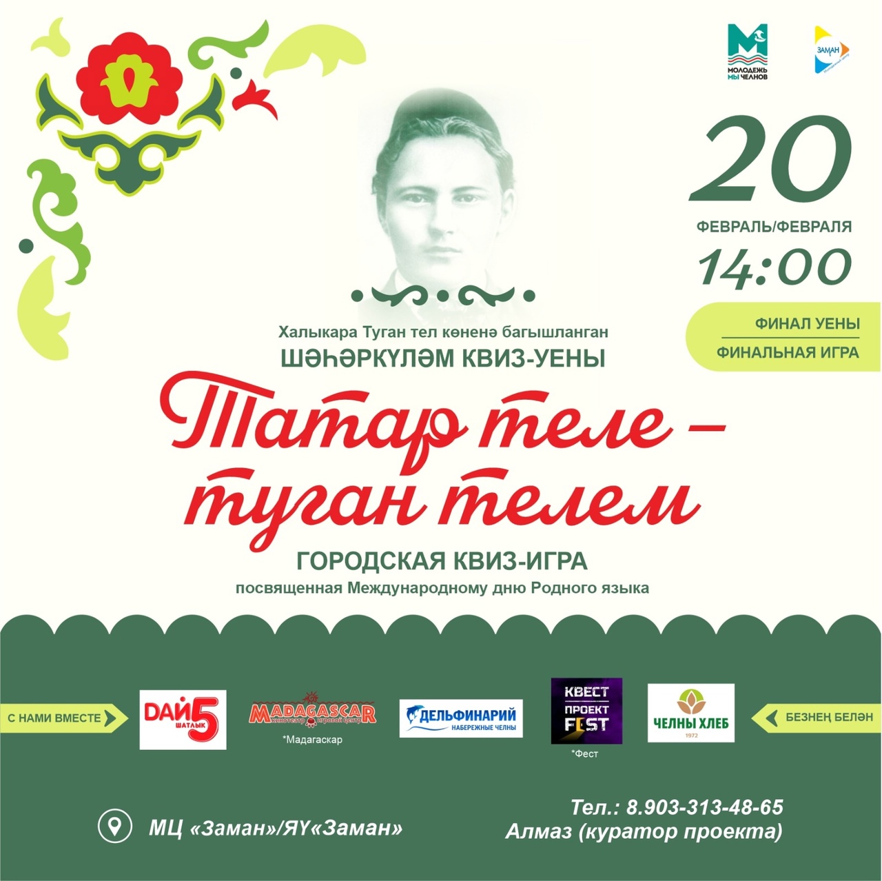 20 февраля в молодежном центре «Заман» состоится заключительная игра «Татар теле – туган телем». Начало в 14:00. Оценивать игру будут компетентное жюри, состоящее из специалистов культуры, педагогов, татарских писателей, журналистов и актеров татарского драматического театра.