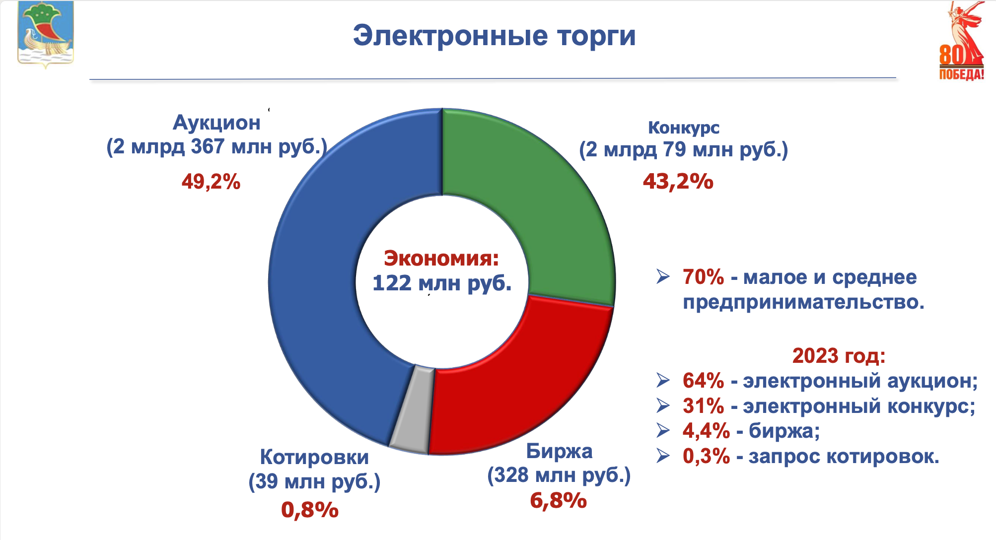 Из электронных торгов на сумму 2 млрд 367 млн рублей размещена электронными аукционами; электронными конкурсами проведено 2 млрд 79 млн рублей; на бирже – 328 млн рублей. Электронными котировками 39 млн рублей. Большую часть заказов 70% забрали субъекты малого и среднего предпринимательства. Экономия по результатам торгов составила 122 млн рублей.