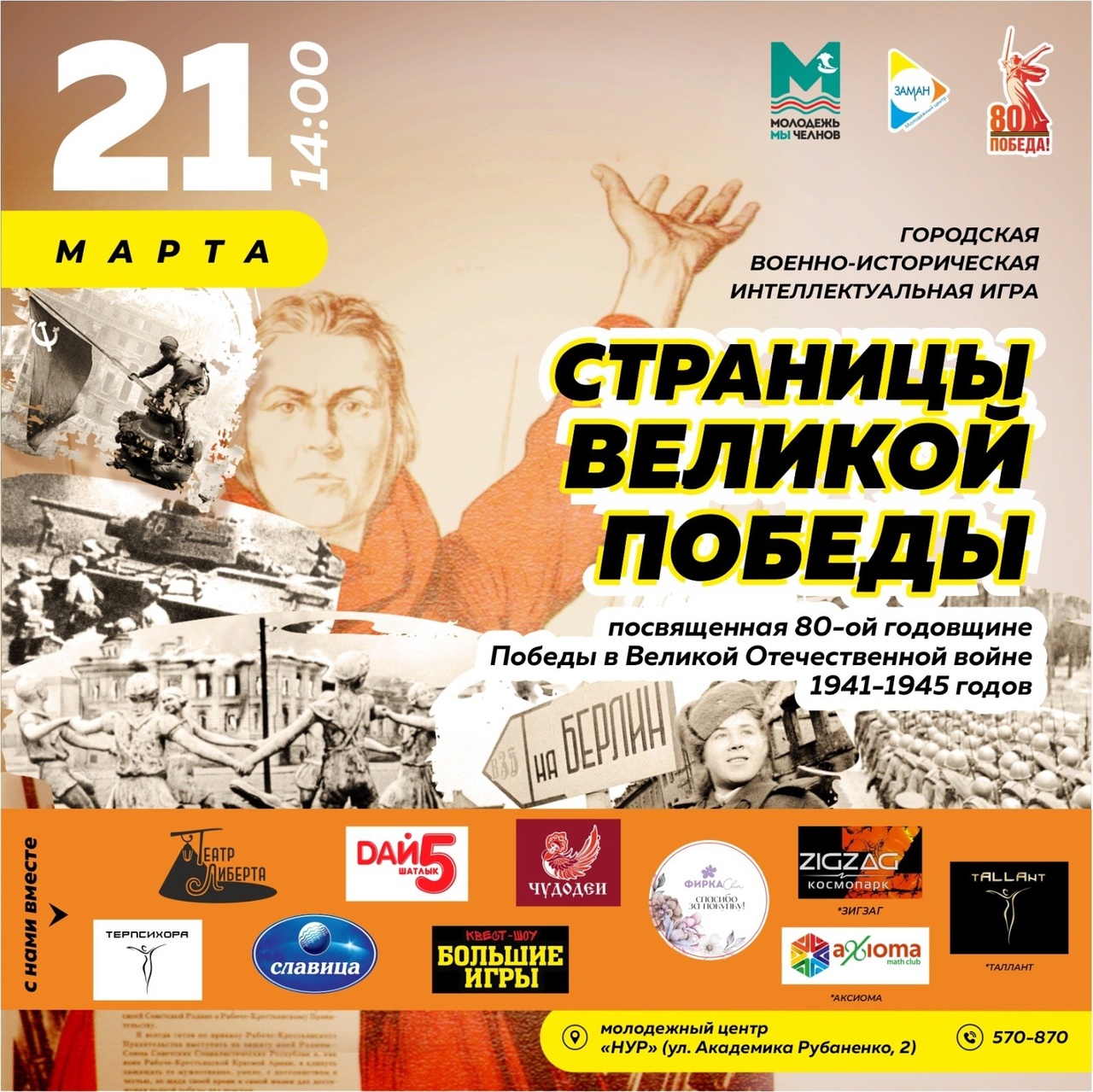 21 марта в молодежном центре «Заман» состоится военно-историческая интеллектуальная игра «Страницы Великой Победы», посвященная Году защитника Отечества и 80-й годовщине Победы в Великой Отечественной войне. В мероприятии примут участие ученики 9-11 классов школ и гимназий города. Начало в 14:00.