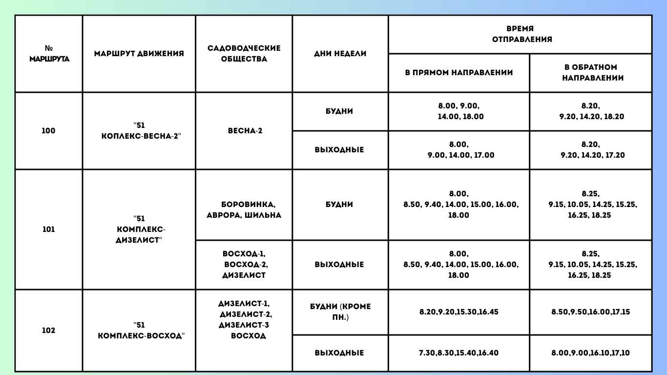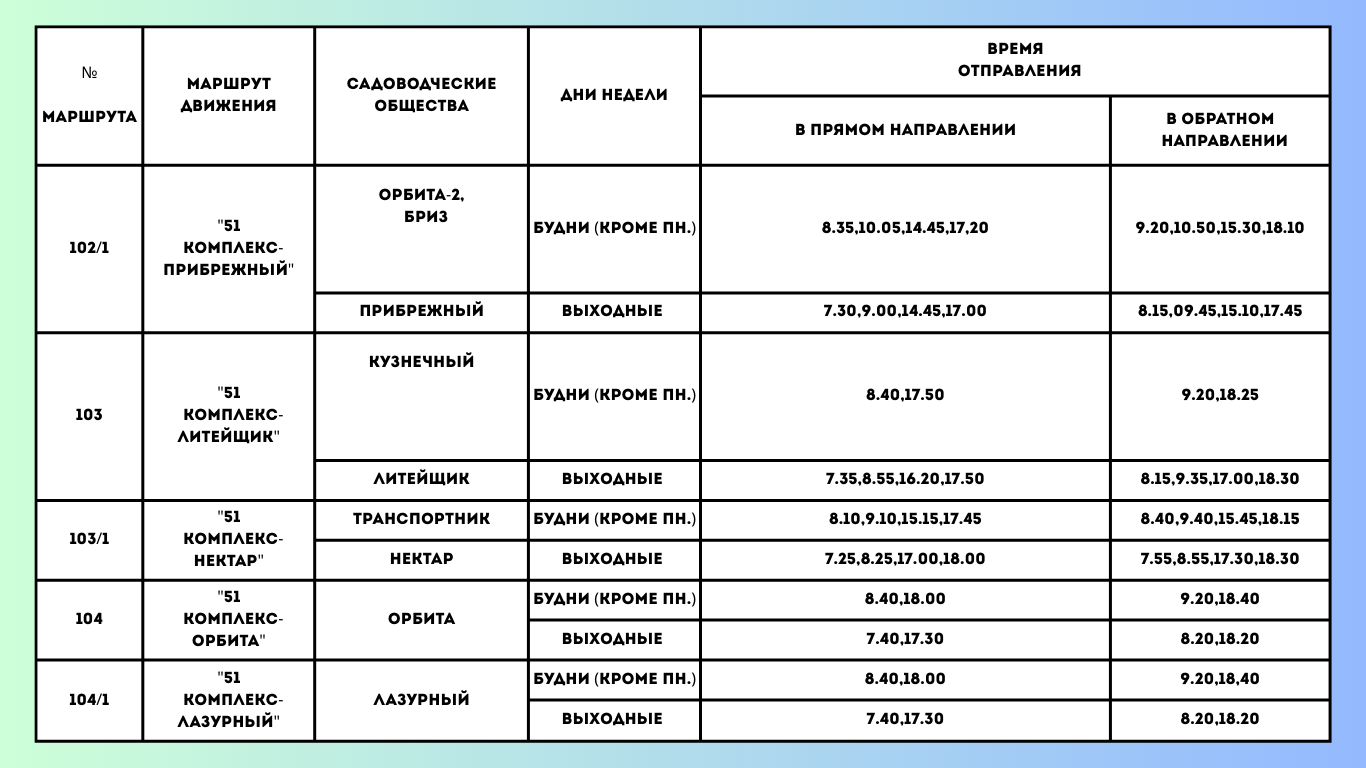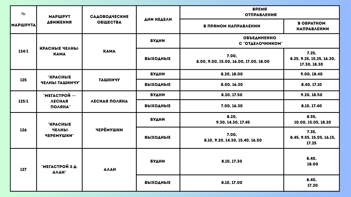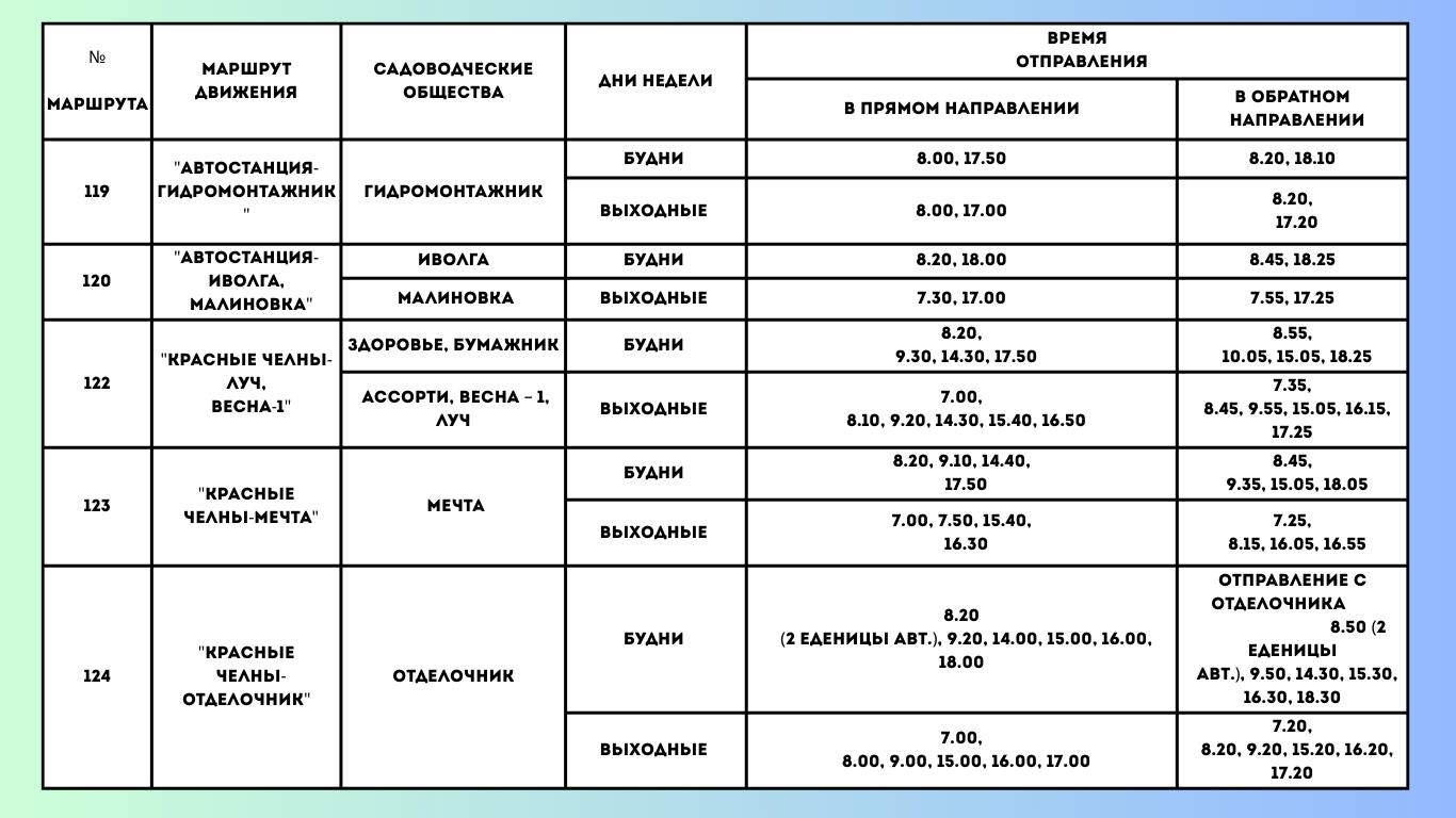 Отправка горожан в садовые общества в 2025 году предусмотрена с пяти остановок ‒ конечная «Улица Шамиля Усманова», «Студенческая», «Красные Челны», «Автостанция» и от территория магазина «Мегастрой» по ул. Машиностроительная.