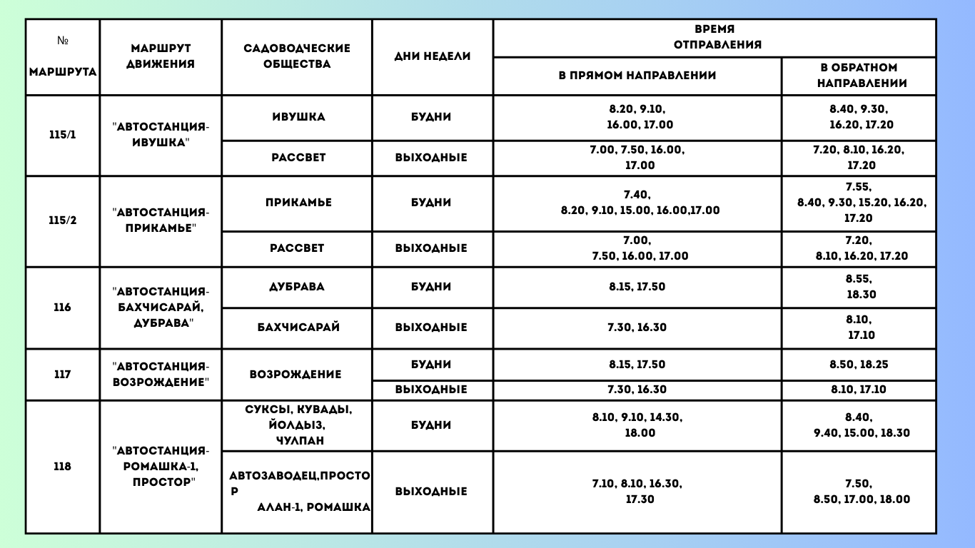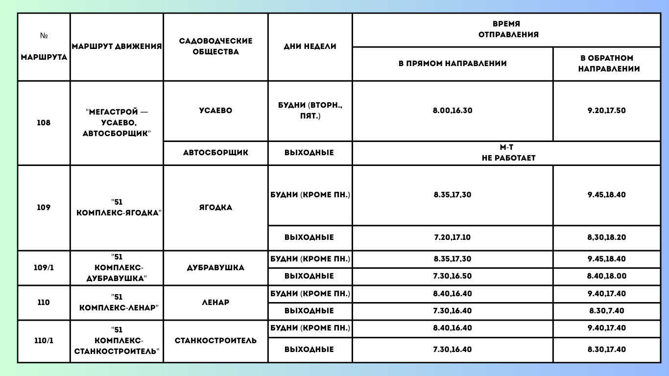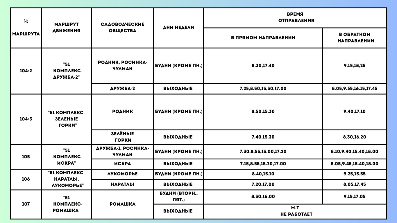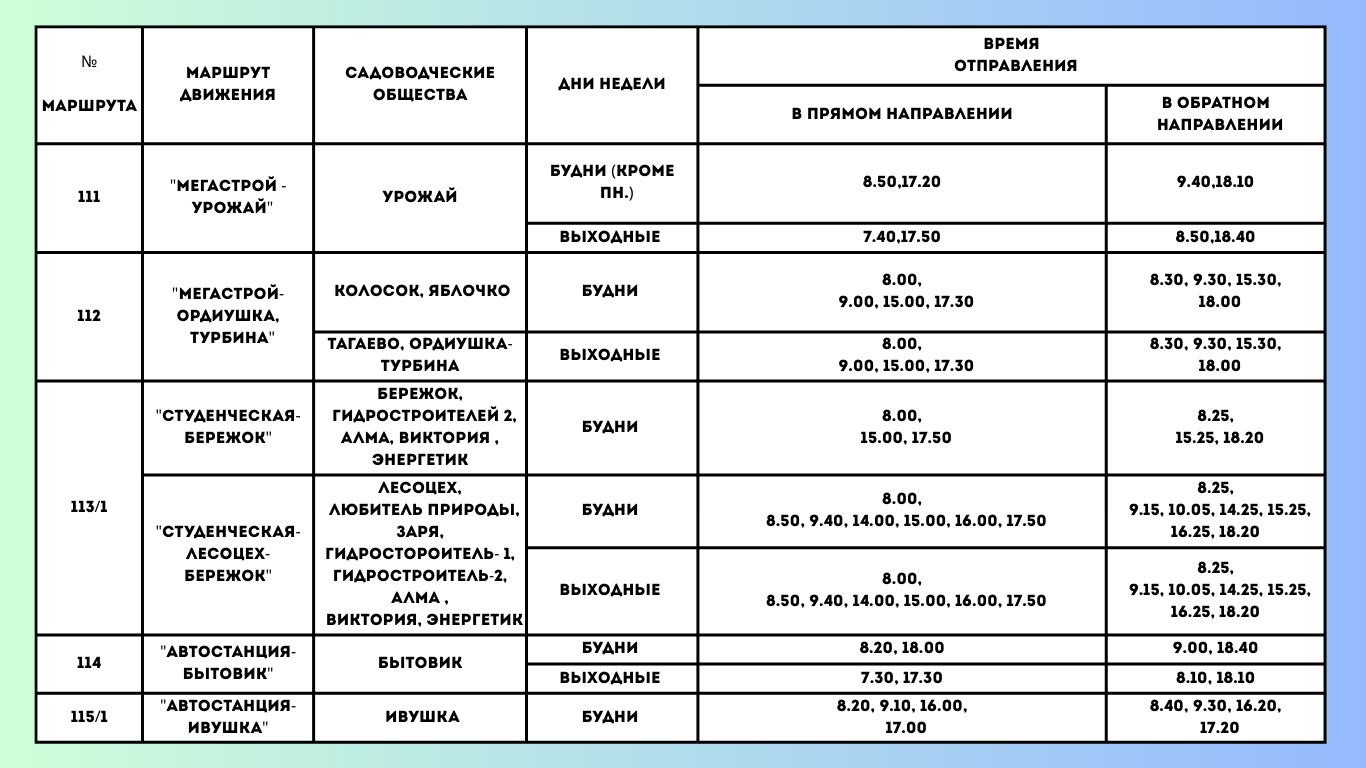 Отправка горожан в садовые общества в 2025 году предусмотрена с пяти остановок ‒ конечная «Улица Шамиля Усманова», «Студенческая», «Красные Челны», «Автостанция» и от территория магазина «Мегастрой» по ул. Машиностроительная.
