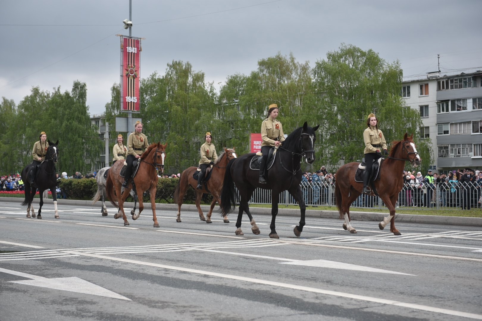 Хәрби комиссар Рәшид Ильясов «Ватан-ана» монументы янындагы парадта катнашучыларның тантаналы узуына команда бирде. Парадта шулай ук техника һәм кавалерия катнашты.