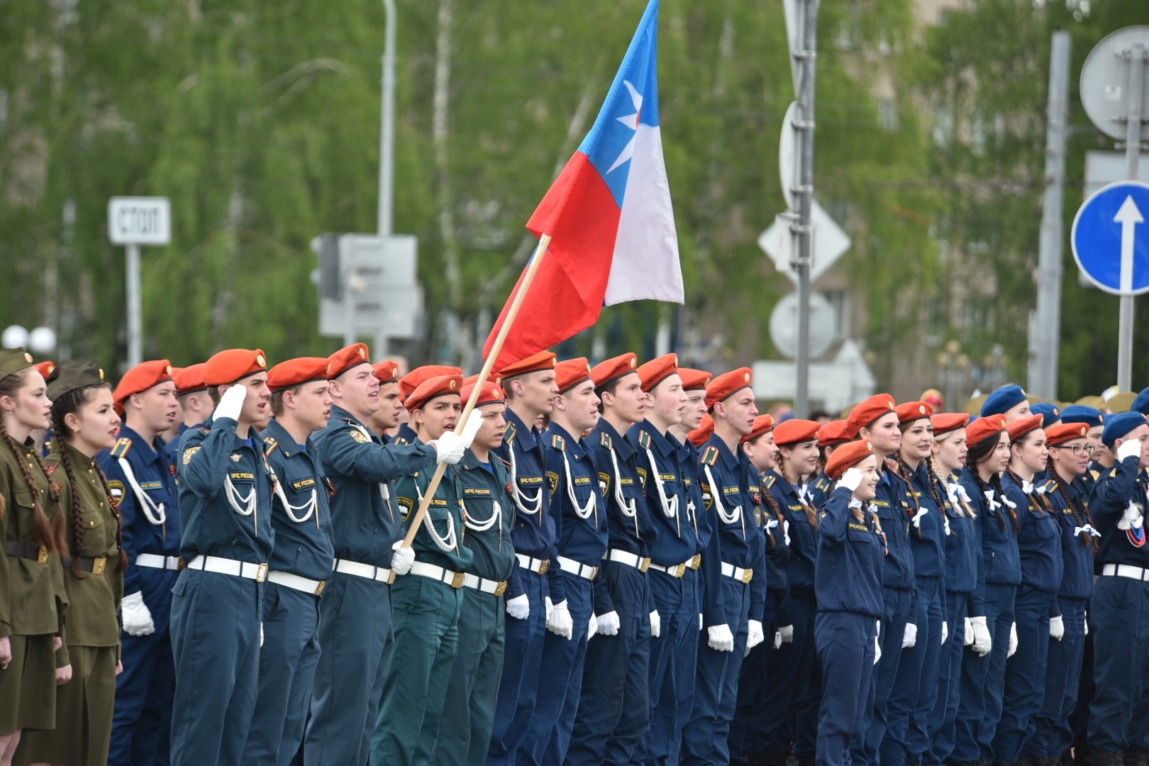 Парадта марш астында яшь армиячеләр — шәһәрнең 30, 84, 42 нче мәктәп укучылары, студентлар, хәрби уку йортлары шәкертләре, эчке эшләр органнары подразделениеләре, хәрби оешмалар вәкилләре катнашты.