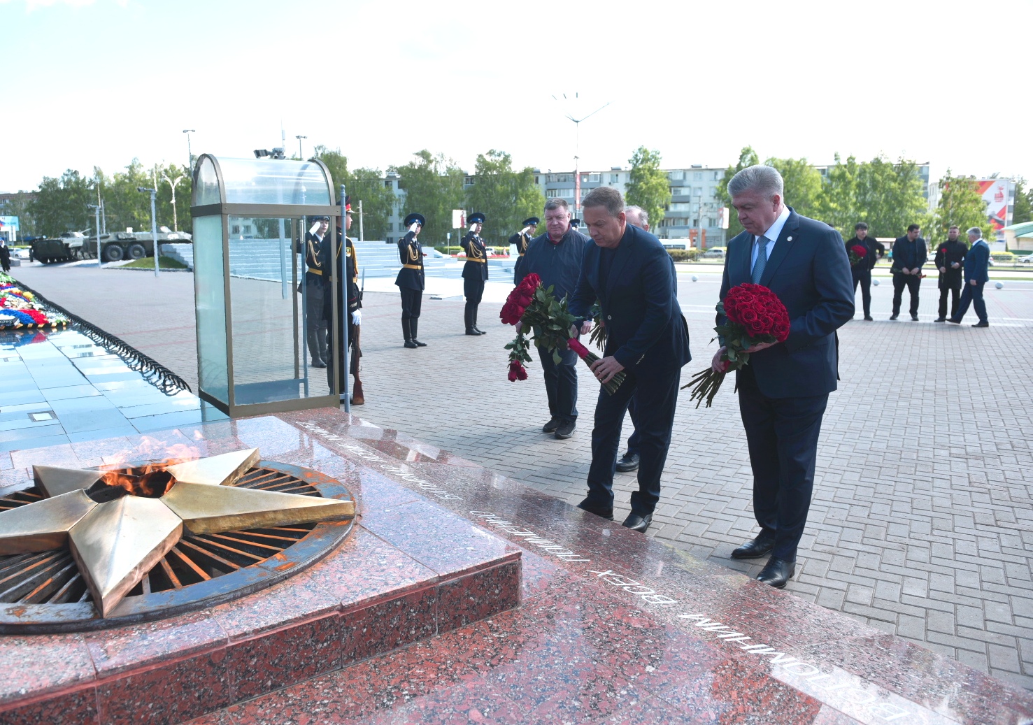 Делегация возложила цветы к Вечному огню на мемориальном комплексе «Родина-мать». Мэр города рассказал гостям историю строительства города и возведения памятника.