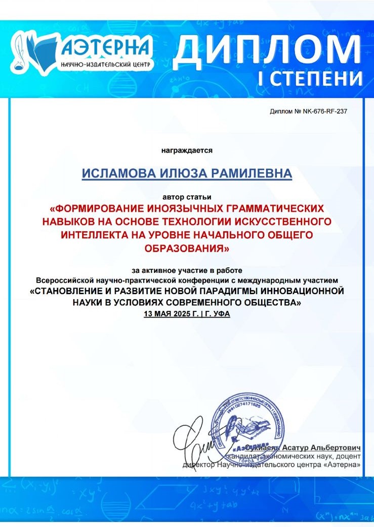 Өфә шәһәрендә уздырылган фәнни-гамәли конференциядә катнашып Илюзә Исламова дипломга лаек булды.