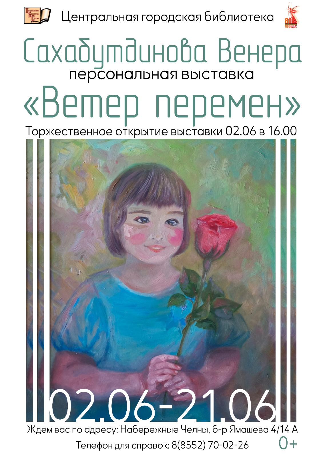 В малой картинной галерее Центральной городской библиотеки 2 июня в 16:00 состоится открытие первой персональной выставки художницы Венеры Сахабутдиновой. Она активно участвует в различных выставочных проектах и входит в состав творческой группы «Ак калфак».