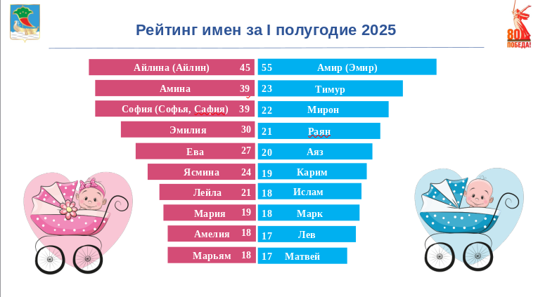 Равиля Зарипова отметила, что многих родителей привлекает уникальность и оригинальность. Так среди мужских имен встречаются: Ансель, Дияр, Гапур, Ёсин, Зейд; среди женских имен: Астрид, Кабе, Лионелла, Санам, Селби. Двойные имена получили девочки Анна София, Идиль Ада.