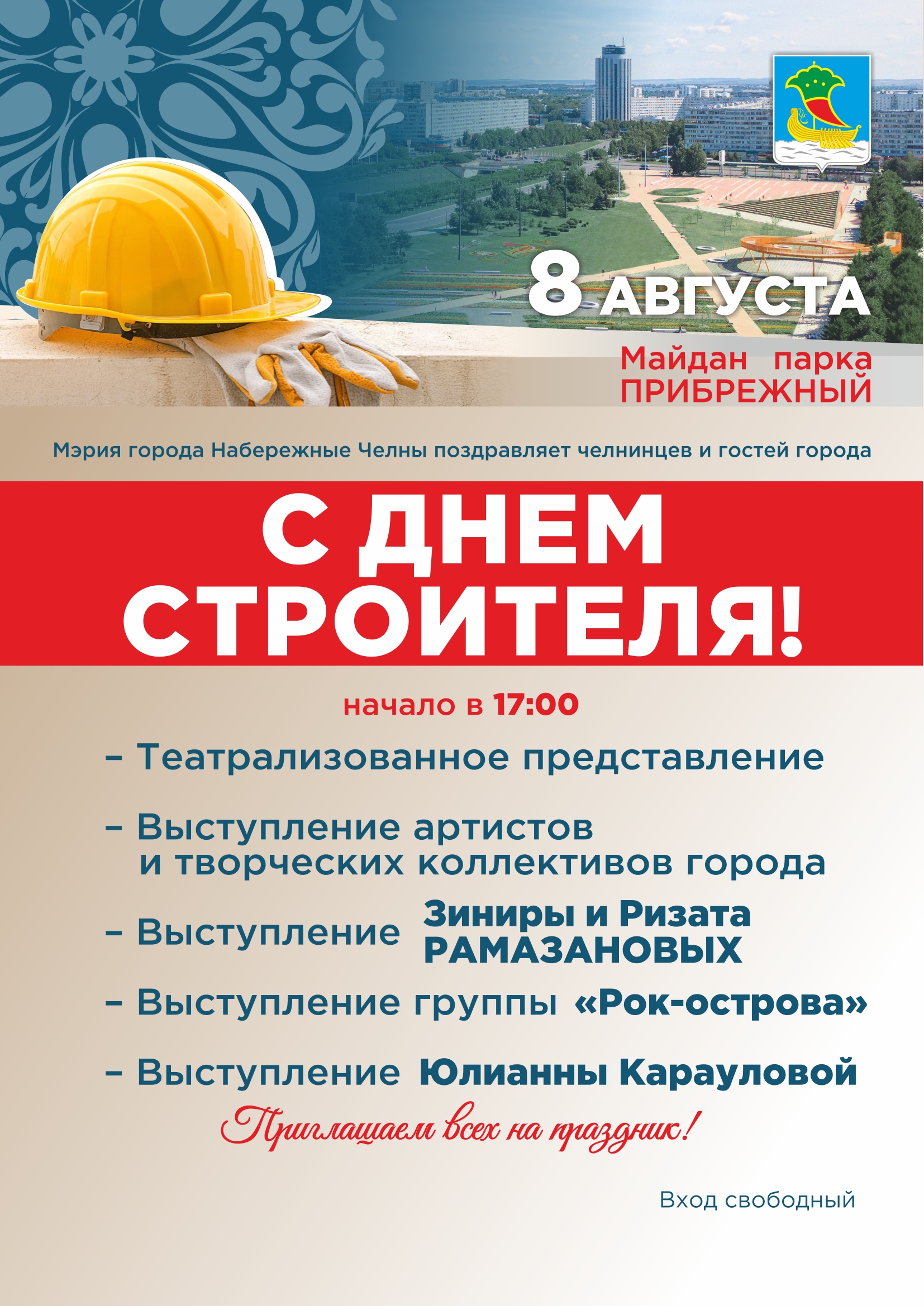 Администрация города Набережные Челны приглашает челнинцев и гостей города на День строителя. Он состоится 8 августа на майдане парка Прибрежный, начало – в 17:00.