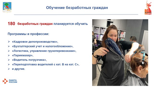 Татьяна Быданова напомнила об обучении граждан в рамках федерального проекта «Активные меры содействия занятости» национального проекта «Кадры» по трехстороннему или двустороннему договору для: «Граждан в возрасте 50 лет и старше; граждан предпенсионного возраста; граждан, фактически осуществляющих уход за ребенком и находящихся в отпуске по уходу за ребенком до достижения им возраста 3 лет; женщин, не состоящих в трудовых отношениях и имеющих детей дошкольного возраста в возрасте от 0 до 7 лет включительно; инвалидов; граждан, обратившихся в органы службы занятости в целях поиска работы; безработных граждан, зарегистрированных в органах службы занятости; ветеранов боевых действий, принимавших участие в специальной военной операции, уволенных с военной службы; членов семей погибших участников специальной военной операции; молодежи в возрасте до 35 лет включительно, относящейся к отдельным категориям». Обучение могут пройти не менее 523 человек.