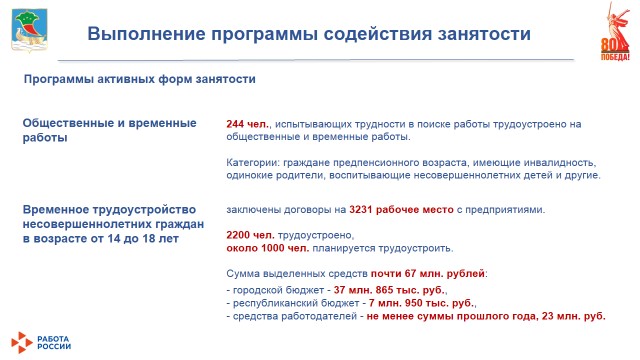 Временно трудоустроены 2200 несовершеннолетних в возрасте от 14 до 18 лет, около 1000 чел. планируется трудоустроить. На эти цели выделено почти 67 млн рублей: из городского бюджета 37 млн 865 тысяч, из республиканского – 7 млн 950 тыс. рублей, средства работодателей составили 23 млн рублей.