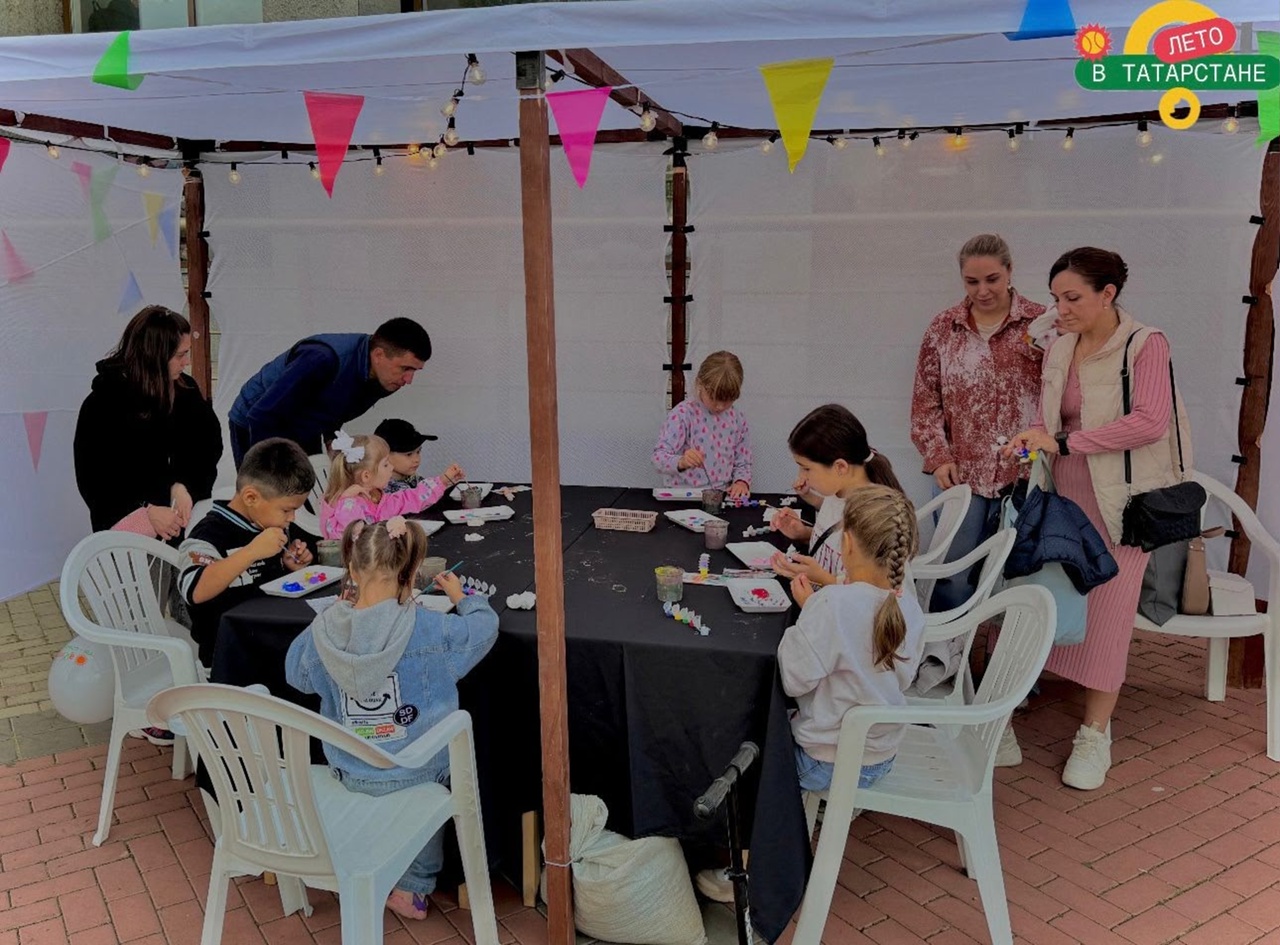 Программа получилась очень насыщенной: юных жителей привлекли мастер-класс «Макраме. Плетение брелоков», роспись гипсовых фигур, мастер-класс по оригами на английском языке.