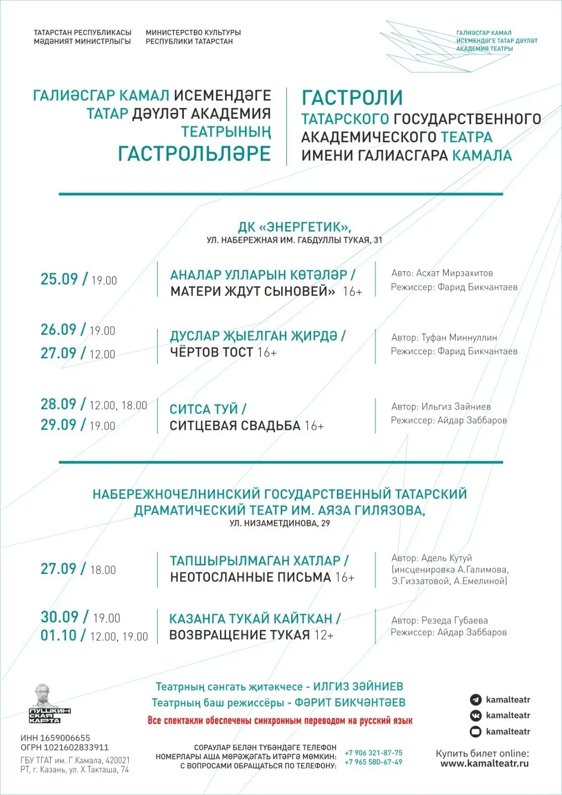 С 25 сентября по 1 октября казанские артисты порадуют челнинцев лучшими спектаклями, которые представят на сценах Дворца культуры «Энергетик» и татарского драматического театра имени Аяза Гилязова. Предстоящие спектакли анонсировал первый заместитель художественного руководителя Татарского государственного Академического театра имени Галиасгара Камала Ильфир Якупов.