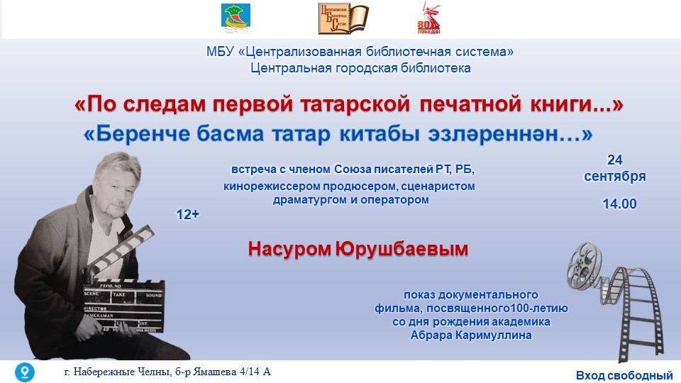 24 сентябрьдә 14:00 сәгатьтә Шәһәр үзәк китапханәсе барлык теләүчеләрне Татарстан, Башкортстан язучылар берлеге әгъзасы, режиссер, продюсер, сценарист һәм оператор Нәсур Юрушбаев белән иҗади очрашуга чакыра.