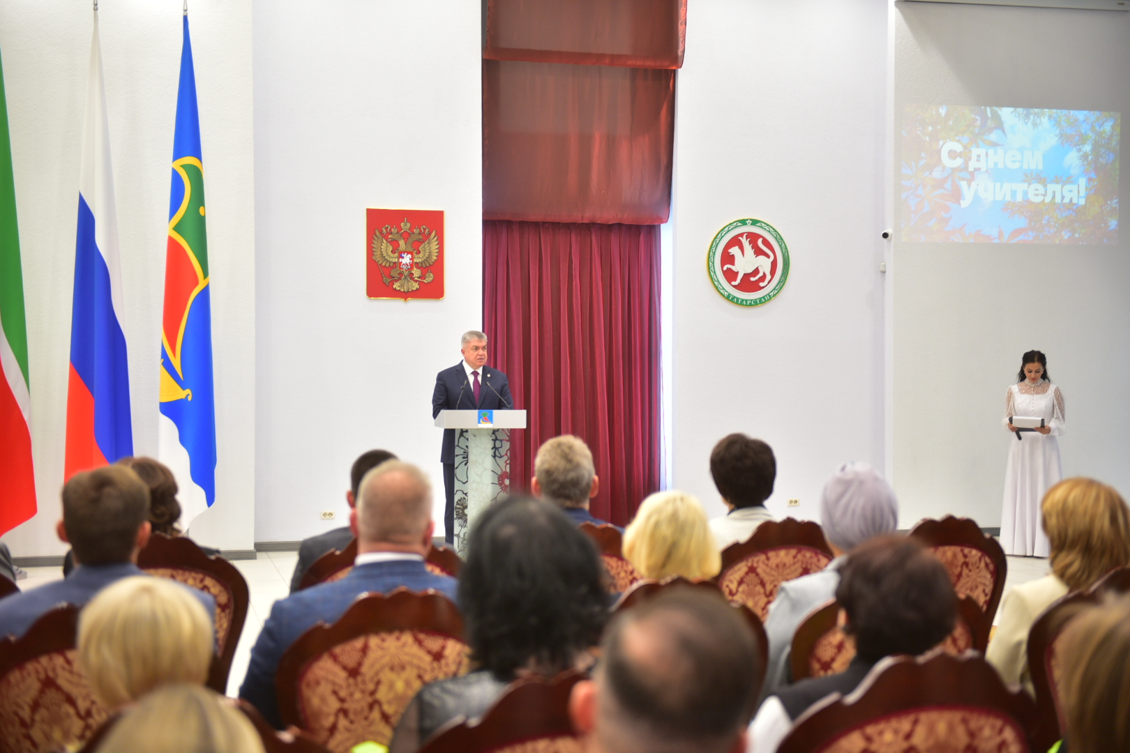 Во Дворце торжеств состоялось праздничное мероприятие с участием работников системы образования, культуры, спорта и молодежи города. Мэр города Наиль Магдеев поприветствовал педагогов: «Сегодня система образования и воспитания города Набережные Челны является лучшей в Российской Федерации, Республике Татарстан. Я процитировал слова уважаемого Раиса Республики Татарстан Рустама Нургалиевича Минниханова. Он дал такую высокую оценку три года назад».