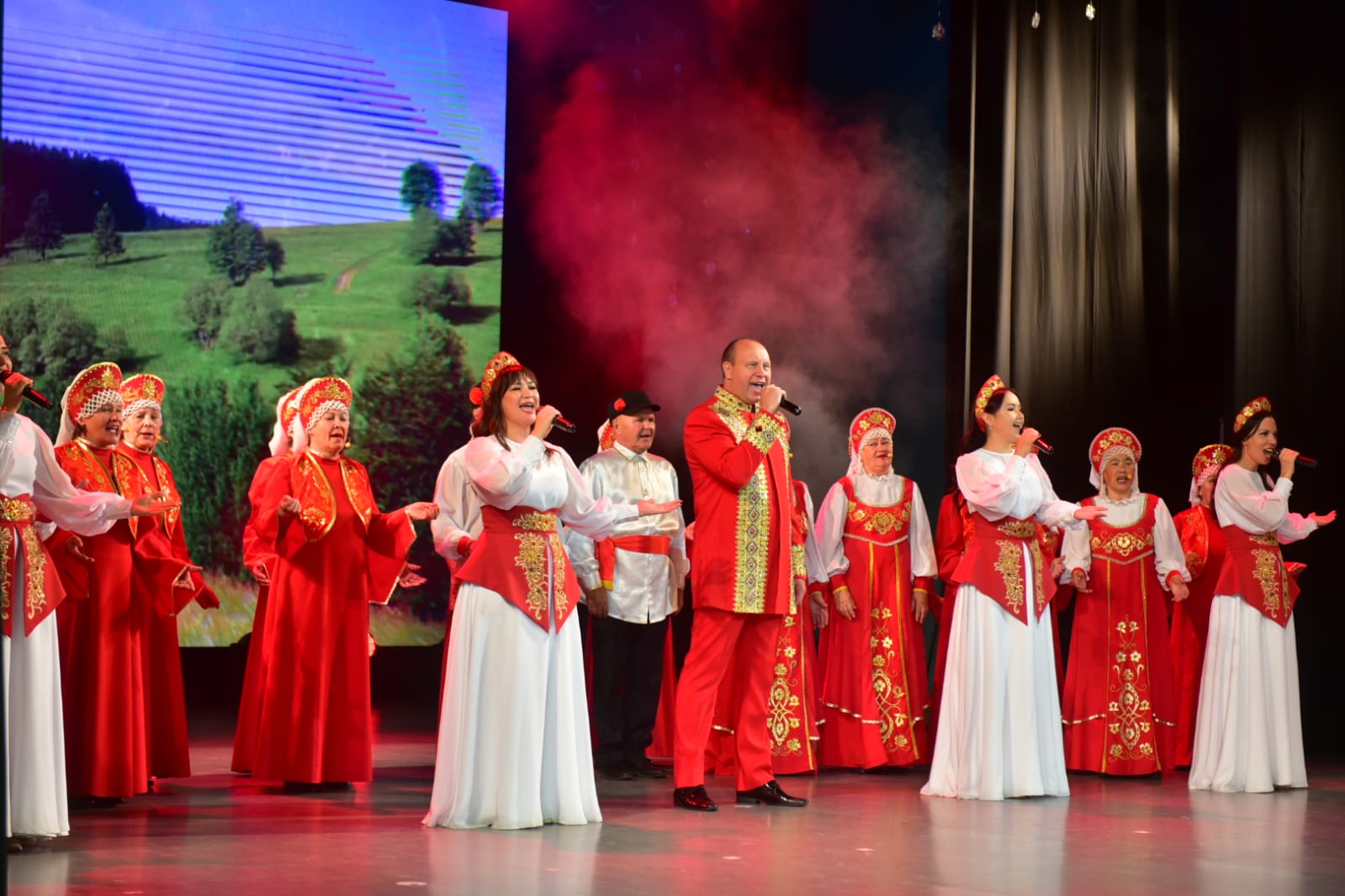 Заслуженный артист Республики Татарстан Фёдор Кузнецов, народный хор ветеранов имени А.Краснова и вокальный ансамбль «Вольница» исполнили вокальную композицию «От Волги до Енисея».