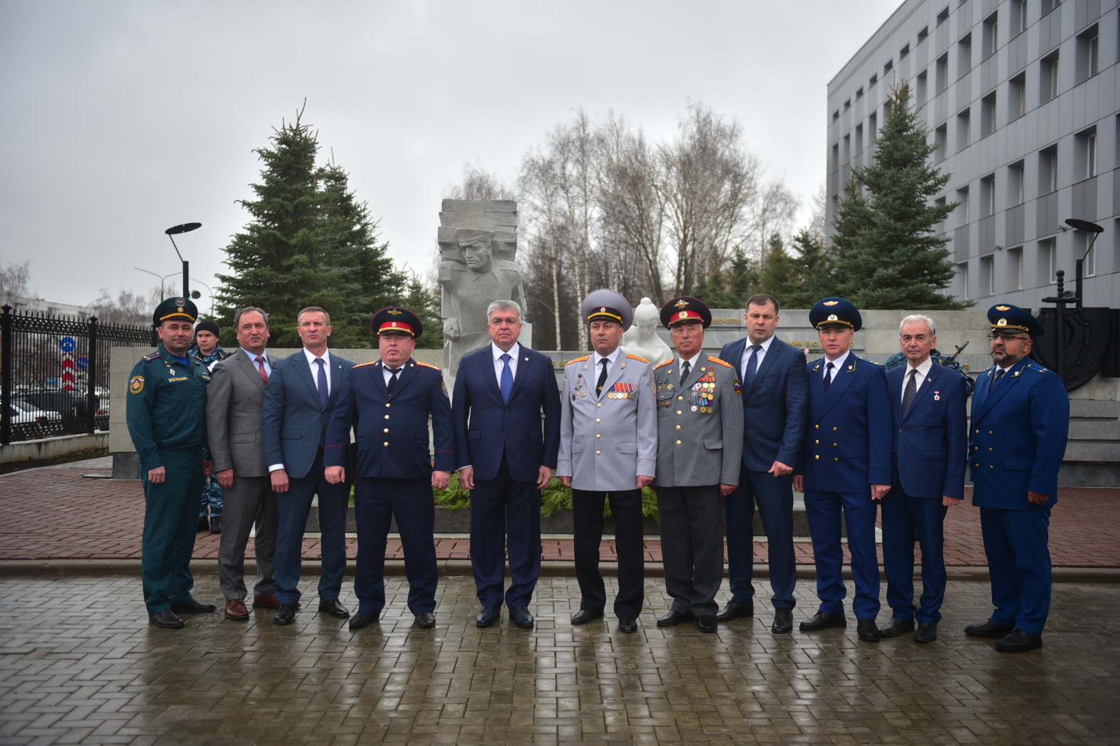До начала церемонии награждения Наиль Магдеев и Айрат Ханбиков вместе с руководителями силовых структур возложили траурный букет к мемориалу сотрудникам органов внутренних дел, погибшим при исполнении служебного долга, а сотрудники 5-й роты отдельного батальона патрульно-постовой службы полиции Управления возложили к мемориалу гирлянду – во время возложения прозвучал троекратный оружейный залп.
