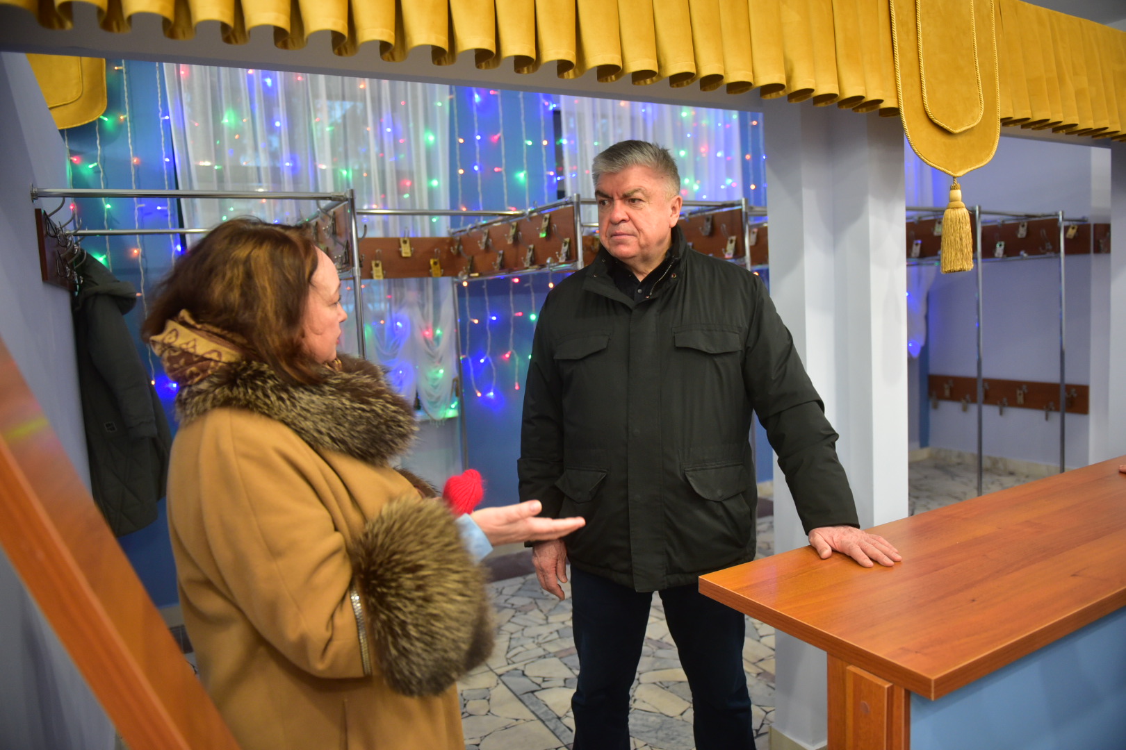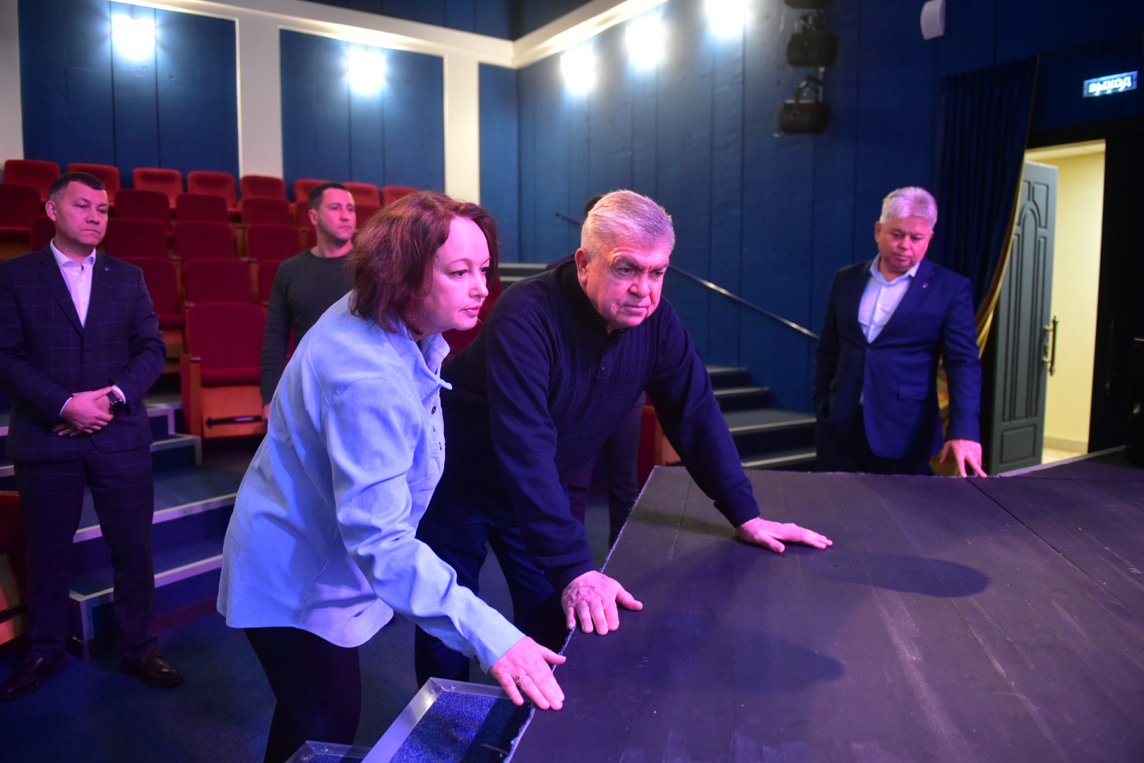 Мэр внимательно осмотрел итоги ремонта, уделив каждому моменту внимание. К примеру, сцена специально адаптирована и поднята на 80 см.