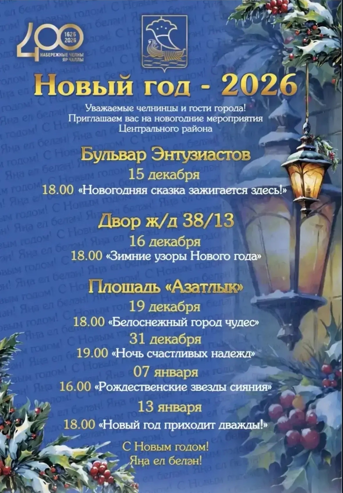 Азатлык мәйданындагы төп чыршы 19 декабрьдә ачыла. Бәйрәм чаралары 11 декабрь көнне башлана. Күңел ачу чаралары Боровецк бульварында башланып китә.