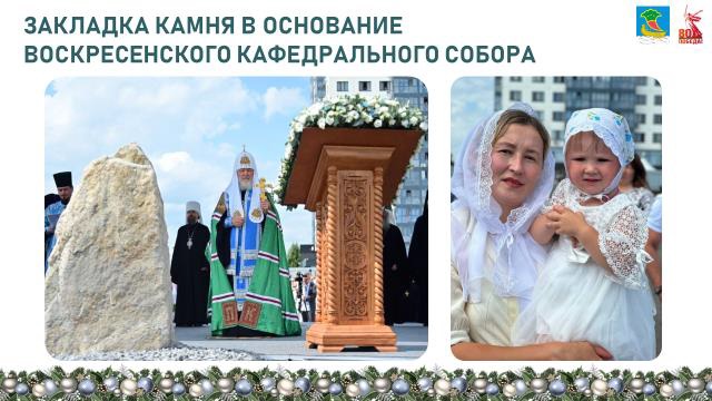 «В июле текущего года произошло знаковое событие. Святейший Патриарх Московский и всея Руси Кирилл заложил камень в основание Воскресенского кафедрального собора. Продолжается строительство Исламского духовно-просветительского центра. В городе открылась и работает Православная гимназия, где детям прививается любовь к родине и духовным ценностям. В 71 микрорайоне города для верующих мусульман построена новая мечеть «Изге Ай». В городе завершилось строительство первой синагоги».
